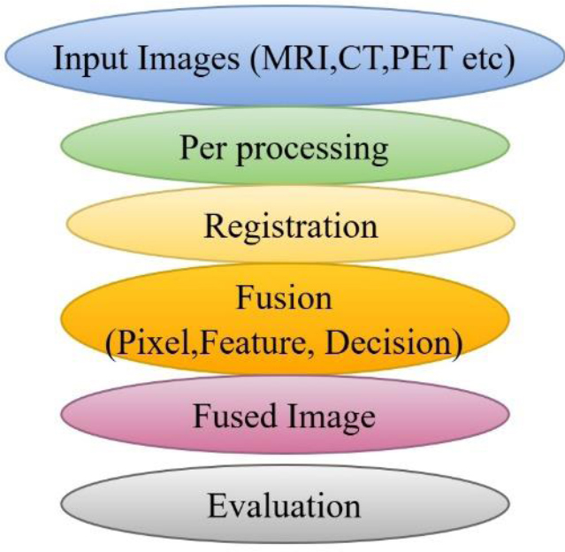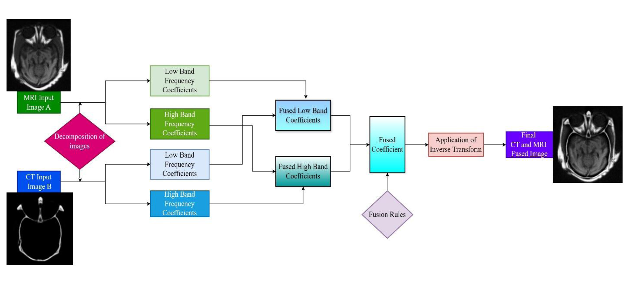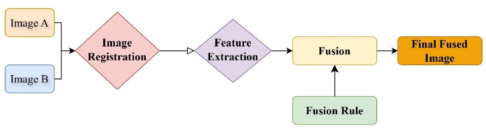 Preprocessing serves as the foundation of MMIF and involves preparing images for further stages by enhancing quality and ensuring uniformity across modalities. This stage includes noise reduction, intensity normalization, contrast enhancement, resolution adjustment, and format conversion. Since different imaging modalities have different spatial resolutions, acquisition angles, and noise characteristics, preprocessing plays a vital role in aligning these disparities. For instance, Magnetic Resonance Imaging (MRI) often exhibits inhomogeneous intensity, while Computed Tomography (CT) is prone to beam-hardening artifacts. Normalizing these differences using histogram equalization or z-score normalization improves the effectiveness of subsequent fusion steps. Additionally, many public datasets like AANLIB provide preprocessed images, including skull stripping and spatial standardization, reducing the preprocessing burden on researchers [15]. Advanced preprocessing techniques such as total variation filtering, anisotropic diffusion, and rolling guidance filters have been adopted in recent MMIF research to preserve structural details while eliminating noise. These techniques are especially beneficial in fusion scenarios involving low-quality or low-contrast images. The process of image fusion is shown in Fig. (6).