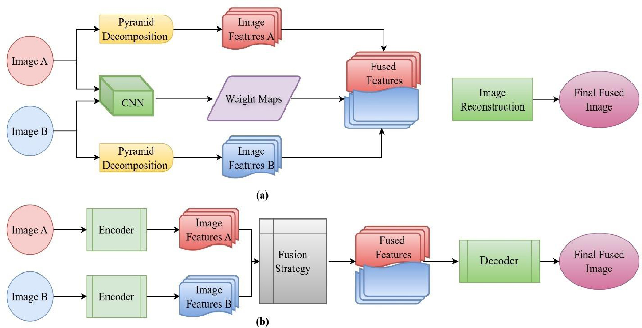 Pixel-level fusion is the most straightforward approach, where corresponding pixels from the source images are directly combined using arithmetic or logical operations. Common methods include weighted averaging, maximum selection, and wavelet-based combination. These methods are computationally efficient but highly sensitive to registration errors and noise. Recent enhancements at this level involve multiscale transforms such as NSCT (Non-subsampled Contourlet Transform), DWT, and shearlet transforms, which improve spatial-frequency localization and reduce artifacts [16]