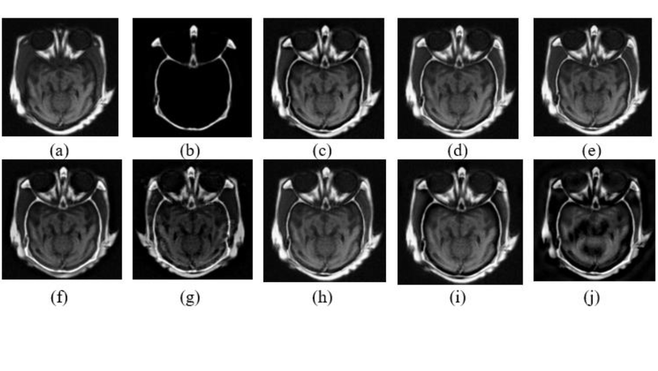 Qualitative results for MRI/CT images Date set 2 (a) CT image, (b) MRI image, (c) LEGFF, (d) FGF-XDoG, (e) MDHU, (f) FDO-DPGF, (g) CSMCA, (h) S-ADE, (i) PCLLE NSCT, (j) NSST AGPCNN.