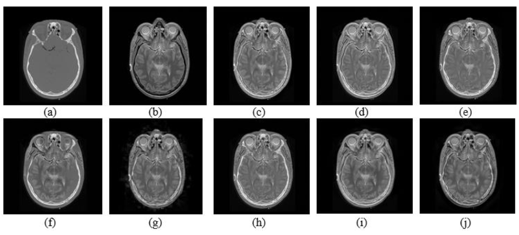 The visual results for dataset 2 are depicted in Fig. (17), where the source image (a) is a computed tomography scan of the brain proficient in assessing intracranial bleed and cerebral fractures. The image provides a clear depiction of the bone architecture with no evident indications of structural abnormalities. The source image (b) is a T2-weighted MRI scan of the brain, illustrating the differentiation of gray and White matter, and is marked by bright cerebrospinal fluid. The imaging modality is effective for identifying pathological alterations, including edema, demyelination, and infarctions. The images from (c) to (j) are the final fused images of these source images using the respective technique.