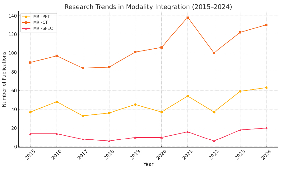 The MRI–SPECT fusion approach is the least discussed, possibly due to the lower spatial resolution and the comparatively narrower use of SPECT compared to PET. The possible correlation of periodic changes in MRI–PET and MRI–CT domains with the emergence of new advances, such as convolutional neural networks or transformer models, indicates that these improvements have likely reinforced the fusion and registration processes. The data shows an increasing interest in hybrid imaging as the main research topic, highlighting the clinical necessity for accurate diagnostics based on the integration of complementary modalities.