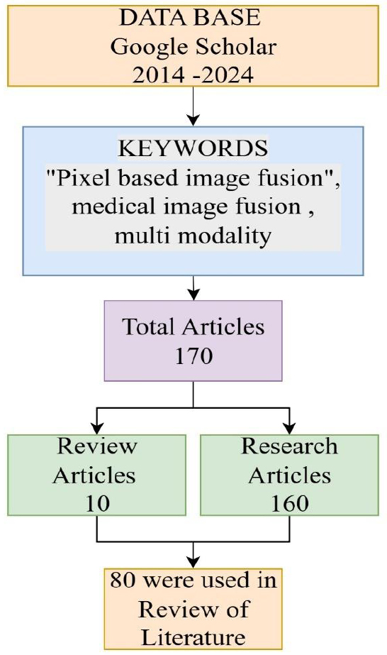 The methodology adopted for this study involved a structured literature search and screening process from 2014–2024. Google Scholar was selected as the principal database due to its comprehensive indexing of scholarly articles across several disciplines, ensuring the inclusion of the most relevant and recent advancements in the field. Specific keywords such as “Pixel-based image fusion,” “medical image fusion,” and “multi-modality” were used. This initial search yielded a total of 170 articles. These were then categorized into review articles (10) and research articles (160) based on their scope and content. The selection process emphasized relevance to the research objectives, specifically focusing on pixel-level fusion methods and their applications in medical imaging. Articles not related to the scope, duplicates, or those with insufficient methodological details were excluded. After this screening, 80 articles were finalized and critically analyzed for the literature review under five different domains, i.e., spatial, transform, deep learning, sparse, and hybrid.