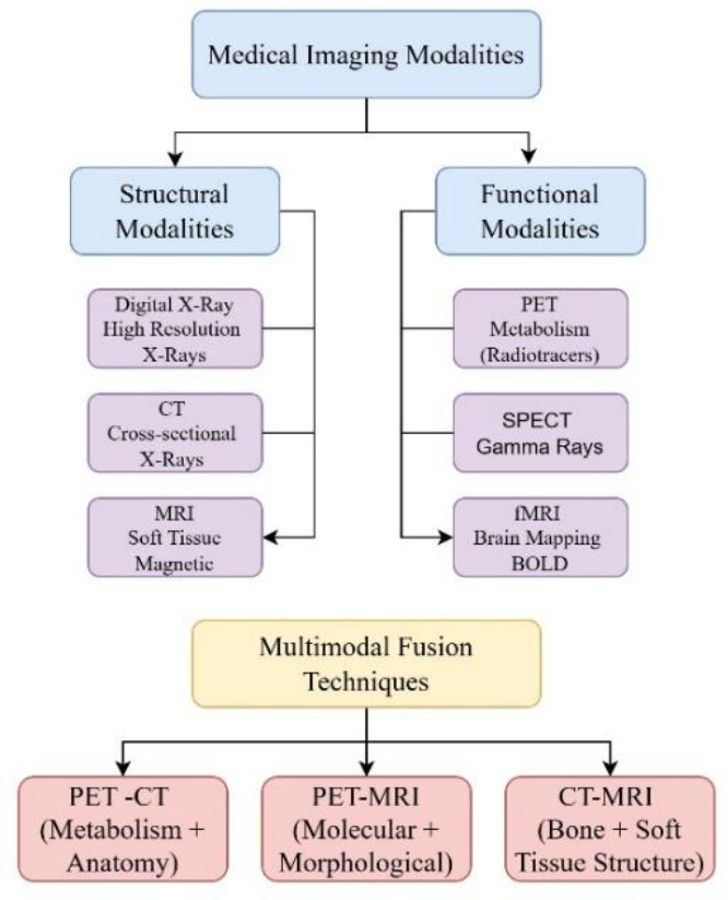 Overview of structural, functional, and multimodal medical imaging modalities.