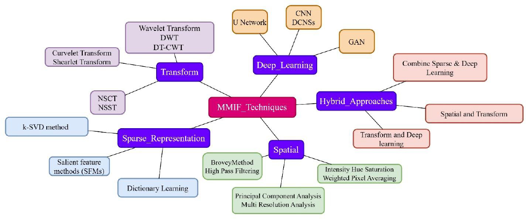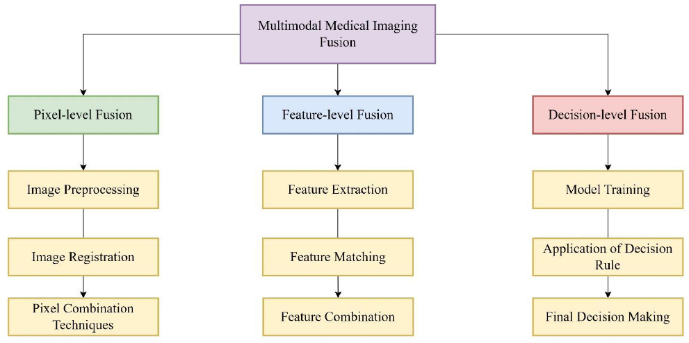 The core of MMIF is the fusion process itself, which combines information from registered images into a single image. Fusion techniques are classified based on the level at which integration occurs, as described in Fig. (7).