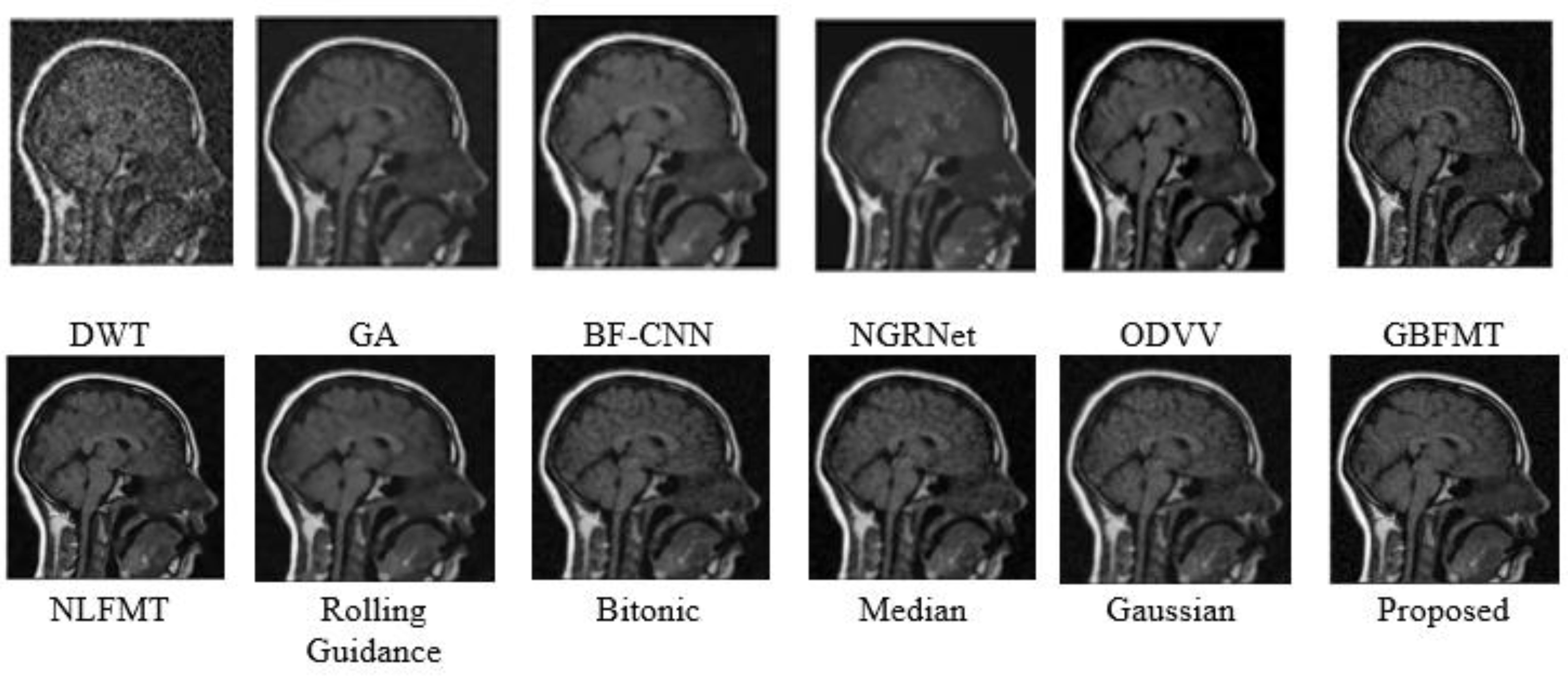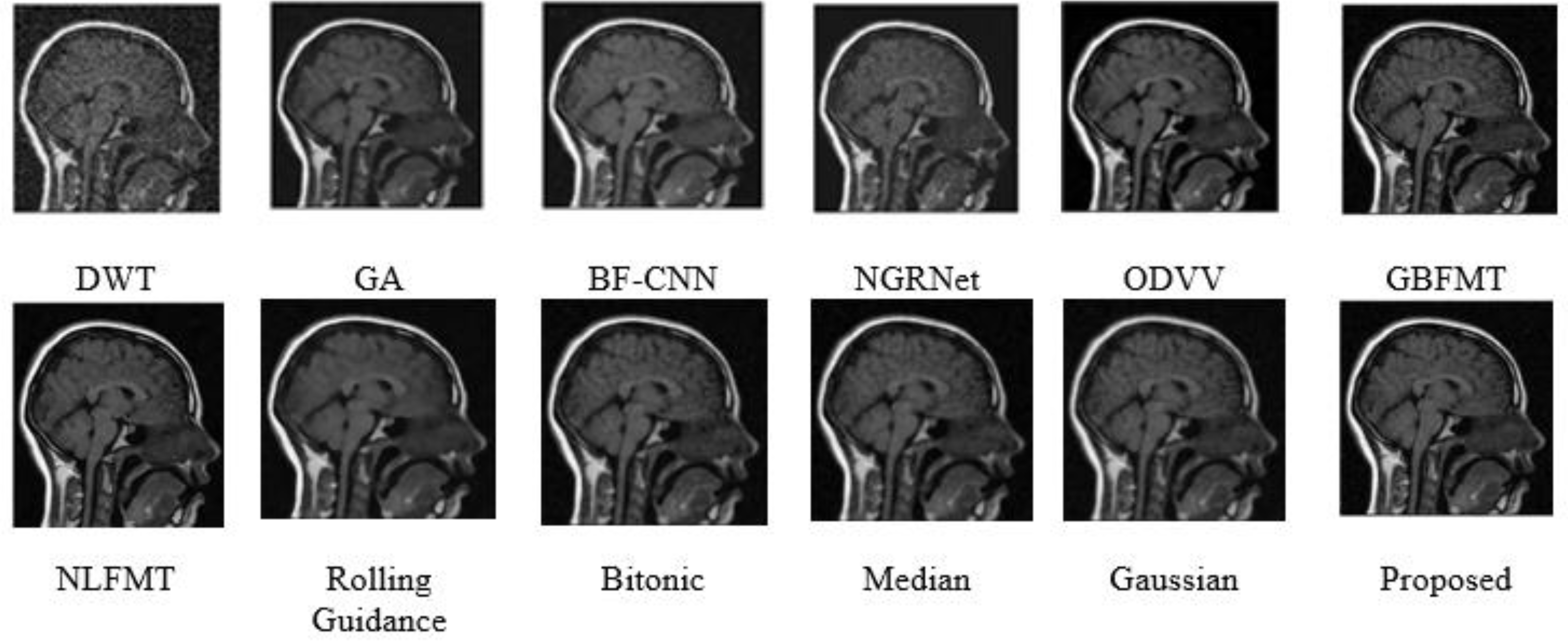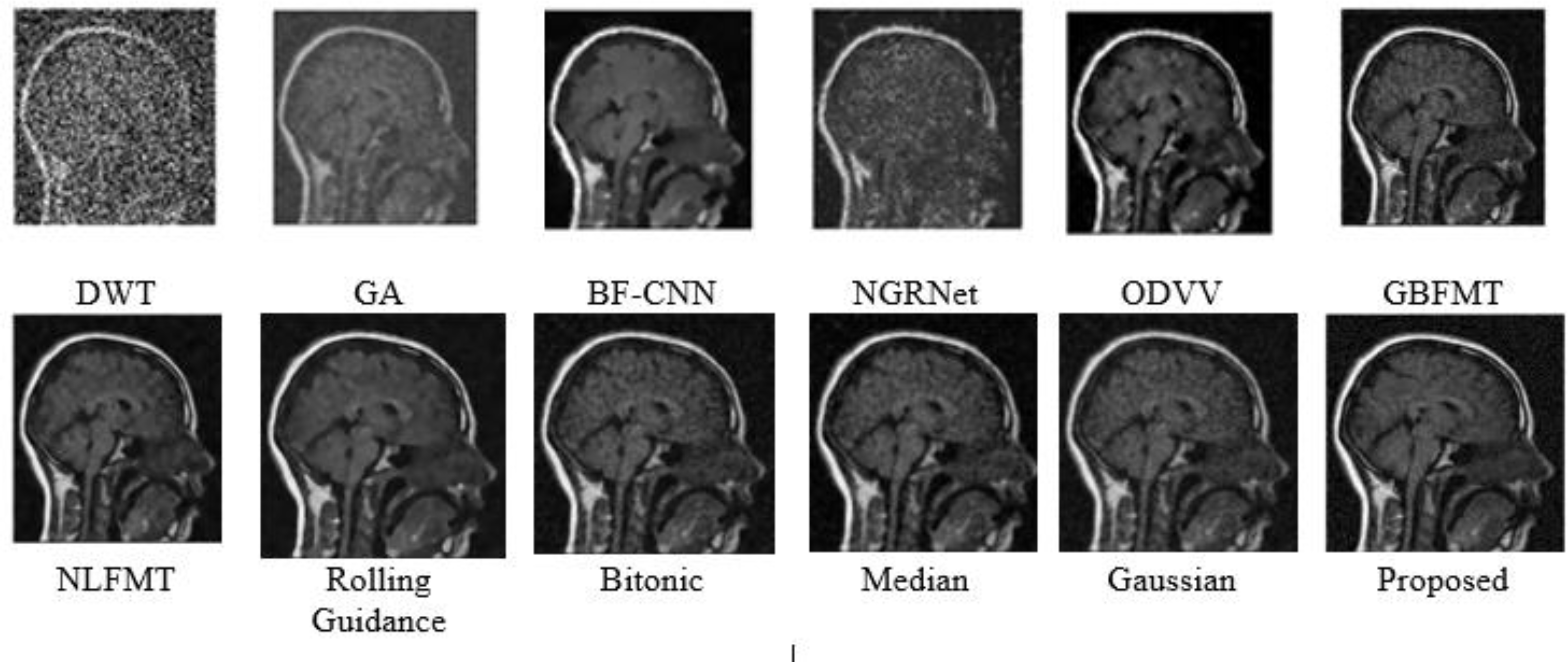 A denoising method using a biquadratic polynomial model with minimum-error requirements and a low-rank approximation was introduced in a study [16]. The technique had high fidelity in details and efficiently suppressed noise, particularly in images with structured noise patterns. Employing a noise generation network, the researchers [17] introduced a blind medical image denoising method that imitates and removes various types of noise without prior knowledge of the noise distribution. Their method enhances generalization and flexibility in many imaging situations. Atal introduced a deep CNN-based vectorial variation filter for medical image denoising. The architecture uses deep learning and vectorial gradients to improve denoising quality while preserving clinical image contrast and structural information [18]. In another study [19], a novel framework is proposed for filtering images with full control over detail smoothing at a scale level. This iterative, simple, and extendable technique achieves real-time performance and delivers artifact-free segmentation results for a wide range of scale structures, with multiple innovative attributes, surpassing existing edge-preserving filters. A new bitonic filter is constructed, featuring a locally adaptive domain and real-image sensor noise adjustments [20]. The filter enhances noise reduction performance while minimizing processing times. It performs better than block-matching 3D filters for extreme additive white Gaussian noise rates and outperforms other non-learning-based filters on publicly released real noise datasets. The filter's signal-to-noise ratio is 2.4dB worse than that of learning-based methods, but it reduces the performance gap when trained on non-correlated data.