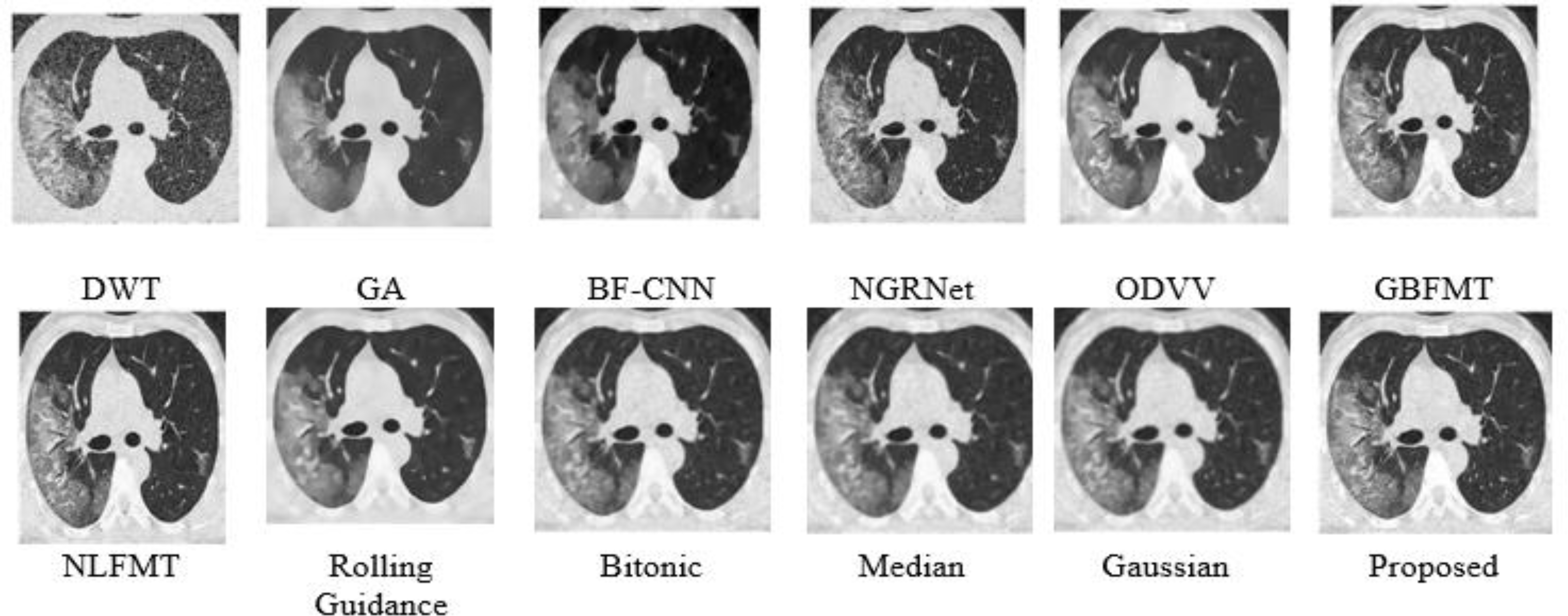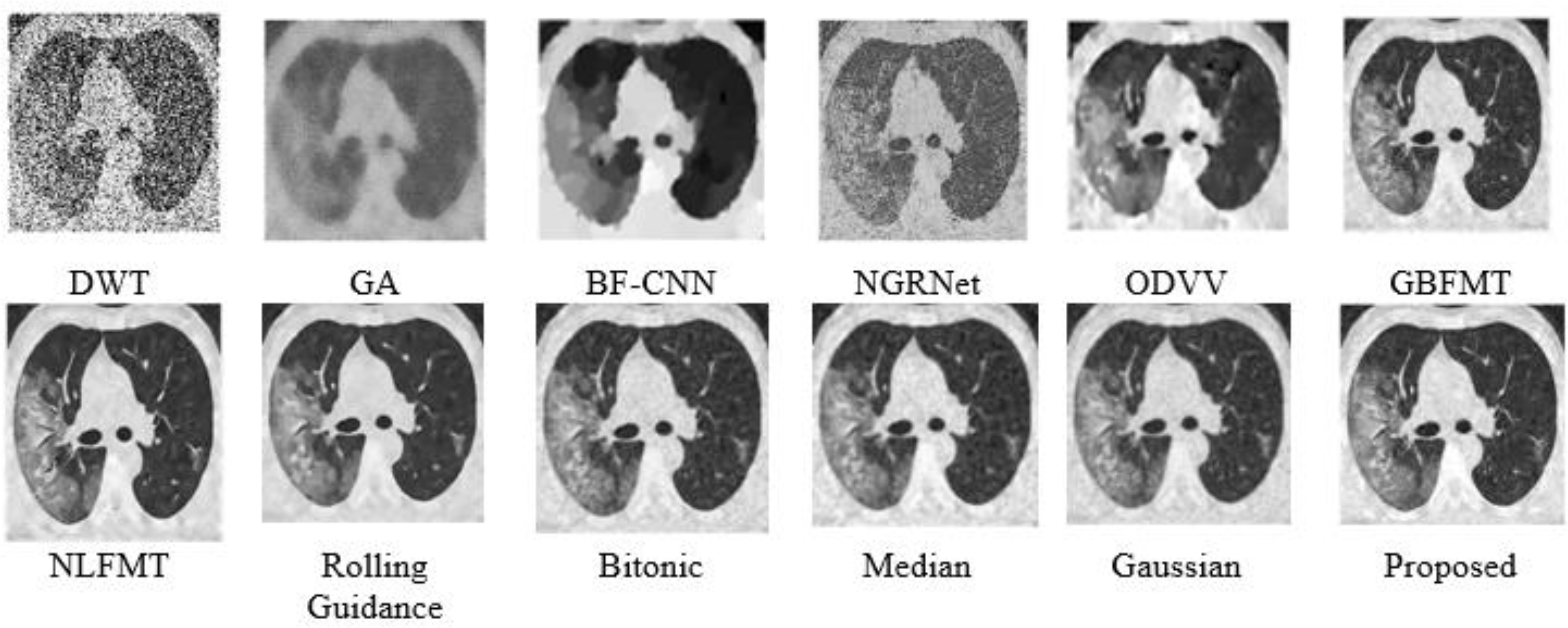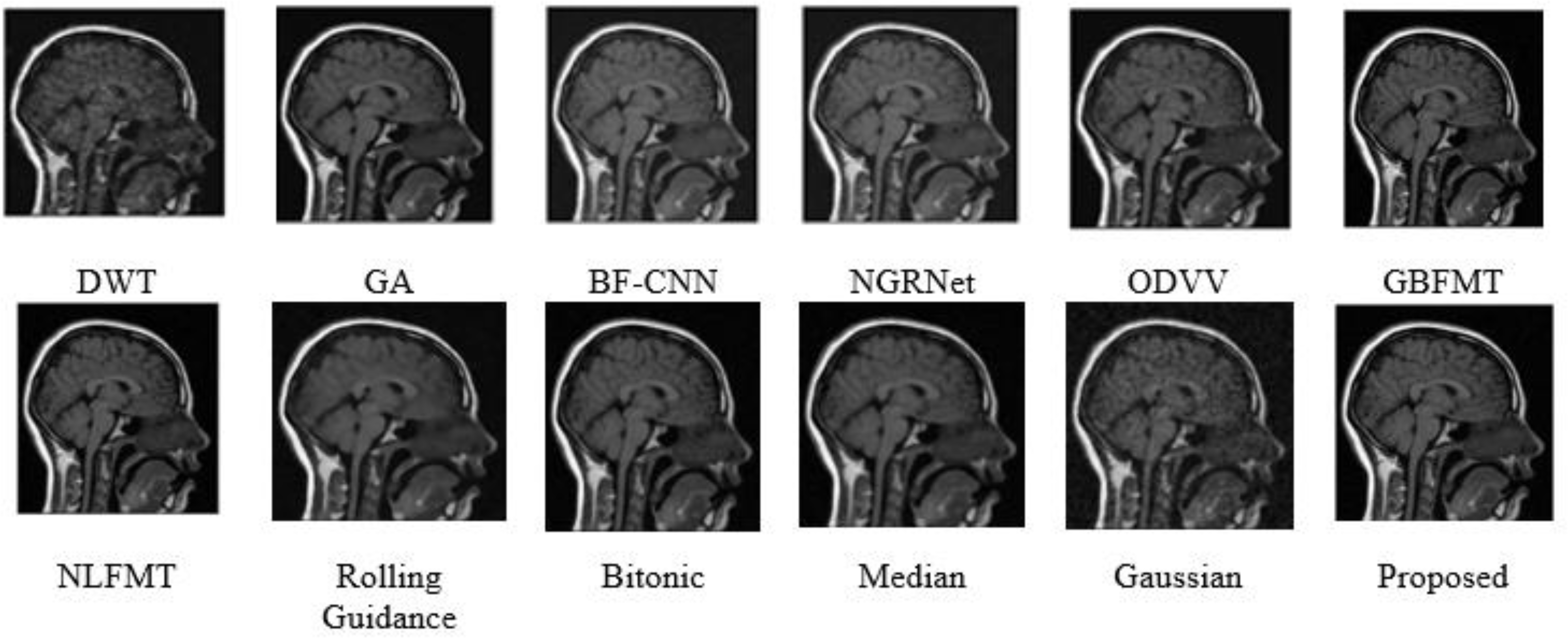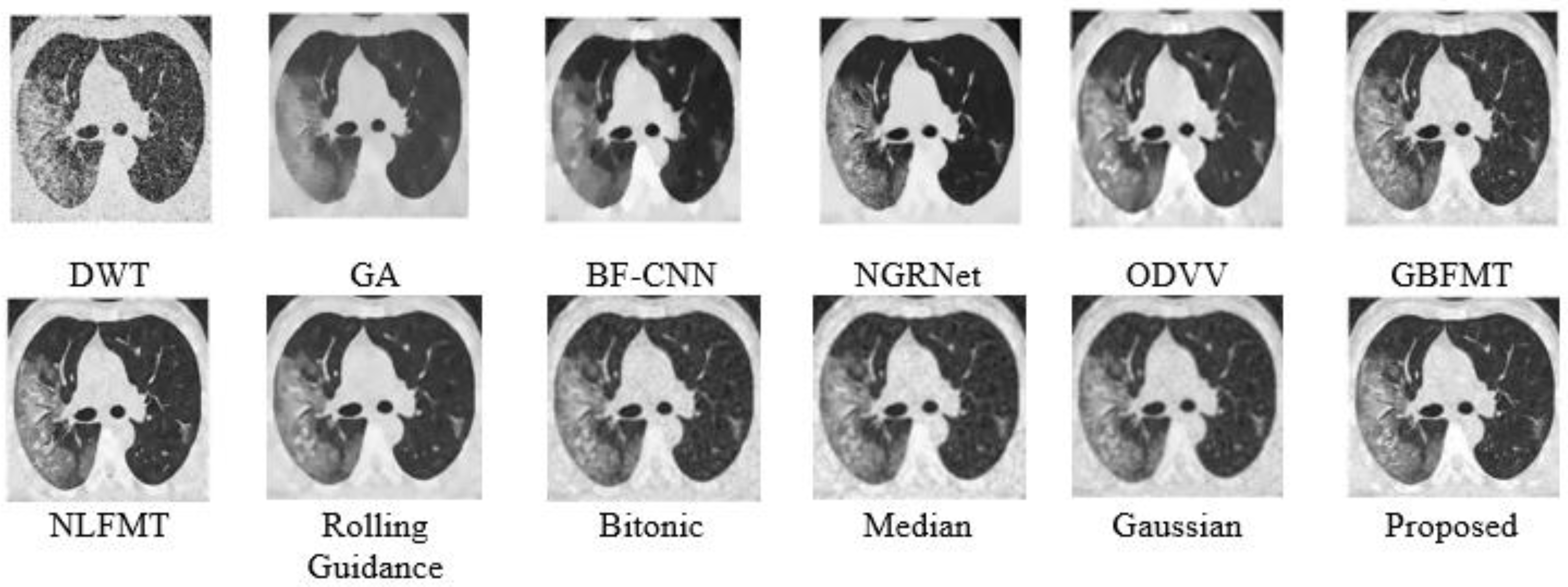 A denoising method using a biquadratic polynomial model with minimum-error requirements and a low-rank approximation was introduced in a study [16]. The technique had high fidelity in details and efficiently suppressed noise, particularly in images with structured noise patterns. Employing a noise generation network, the researchers [17] introduced a blind medical image denoising method that imitates and removes various types of noise without prior knowledge of the noise distribution. Their method enhances generalization and flexibility in many imaging situations. Atal introduced a deep CNN-based vectorial variation filter for medical image denoising. The architecture uses deep learning and vectorial gradients to improve denoising quality while preserving clinical image contrast and structural information [18]. In another study [19], a novel framework is proposed for filtering images with full control over detail smoothing at a scale level. This iterative, simple, and extendable technique achieves real-time performance and delivers artifact-free segmentation results for a wide range of scale structures, with multiple innovative attributes, surpassing existing edge-preserving filters. A new bitonic filter is constructed, featuring a locally adaptive domain and real-image sensor noise adjustments [20]. The filter enhances noise reduction performance while minimizing processing times. It performs better than block-matching 3D filters for extreme additive white Gaussian noise rates and outperforms other non-learning-based filters on publicly released real noise datasets. The filter's signal-to-noise ratio is 2.4dB worse than that of learning-based methods, but it reduces the performance gap when trained on non-correlated data.