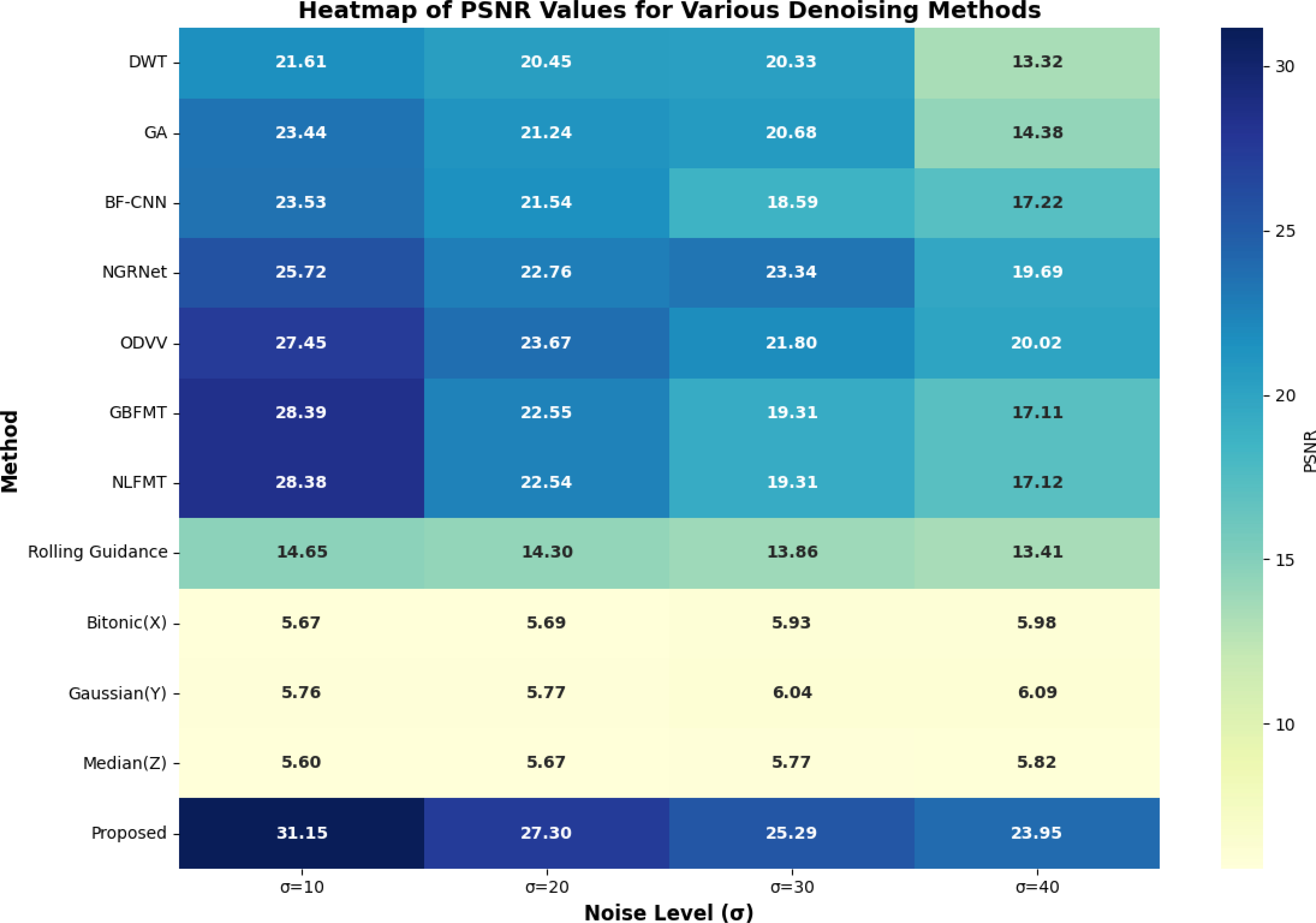 Figure 11 demonstrates the heat map visualization of the PSNR across various denoising methods and noise levels (σ = 10, 20, 30, 40). At σ = 10 and 20, the proposed method has the highest PSNR values (31.15 and 27.30 dB, respectively), outperforming all other non-learning-based and traditional filters (e.g., DWT, GA, Median, and Gaussian) under every level of noise. Learning-based models, such as ODVV and NGRNet, are competitive, particularly at low σ. However, as noise increases, their performance degrades more rapidly, which may be due to overfitting or being overly sensitive to high levels of noise. The consistently low PSNR values resulting from the use of traditional filters, such as Bitonic, Gaussian, and Median, reflect their limitations in the presence of extensive noise interference. GBFMT and NLFMT are two manual filters that perform well at lower noise levels (σ = 10), but they significantly degrade as the noise level increases.