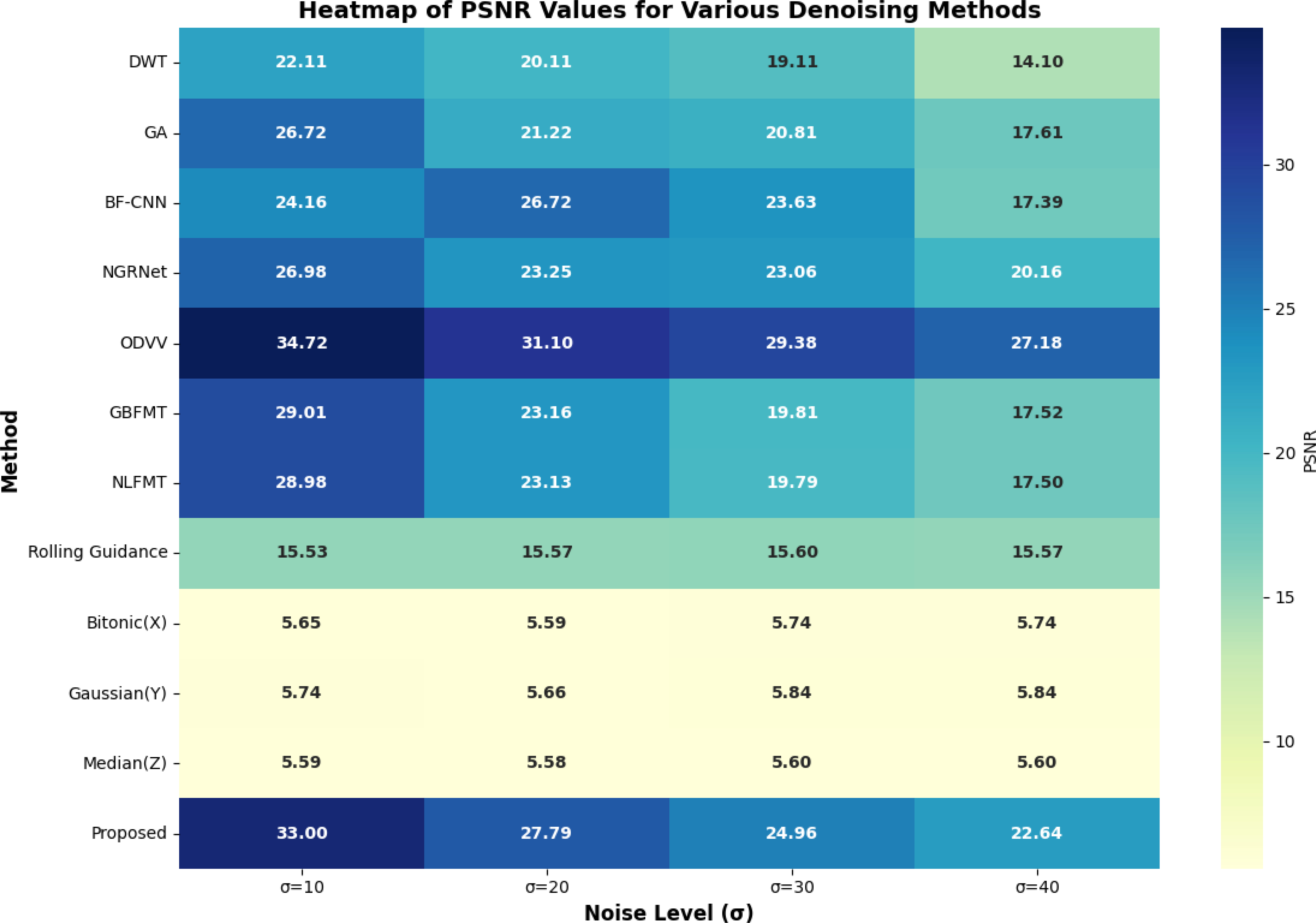 A heatmap of PSNR values for various image denoising methods at different noise levels (σ = 10, 20, 30, 40) is shown in Fig. (12). The denoising method is shown in each row, and the noise level in each column. A graphical assessment of each method's performance is offered by the PSNR values, which are colour-coded from light (lower PSNR) to dark (higher PSNR). As indicated by the heatmap, the ODVV method consistently yields the highest PSNR values for all noise levels, demonstrating superior denoising performance, particularly at lower noise levels (σ = 10, PSNR = 34.72). The proposed method also performs better than a number of other advanced methods, such as GA, BF-CNN, and NGRNet, achieving the second-highest PSNR values under all noise levels (e.g., 33.00 at σ=10 and 22.64 at σ=40). The PSNR values of traditional filtering methods, such as Bitonic, Gaussian, and Median, are significantly lower (at approximately 5–6), reflecting their inferior performance in high-noise environments. Overall, this heatmap clearly demonstrates the proposed algorithm's competitive advantage, particularly under high-noise conditions, and confirms that it is one of the top approaches based on reconstruction quality measured by PSNR.