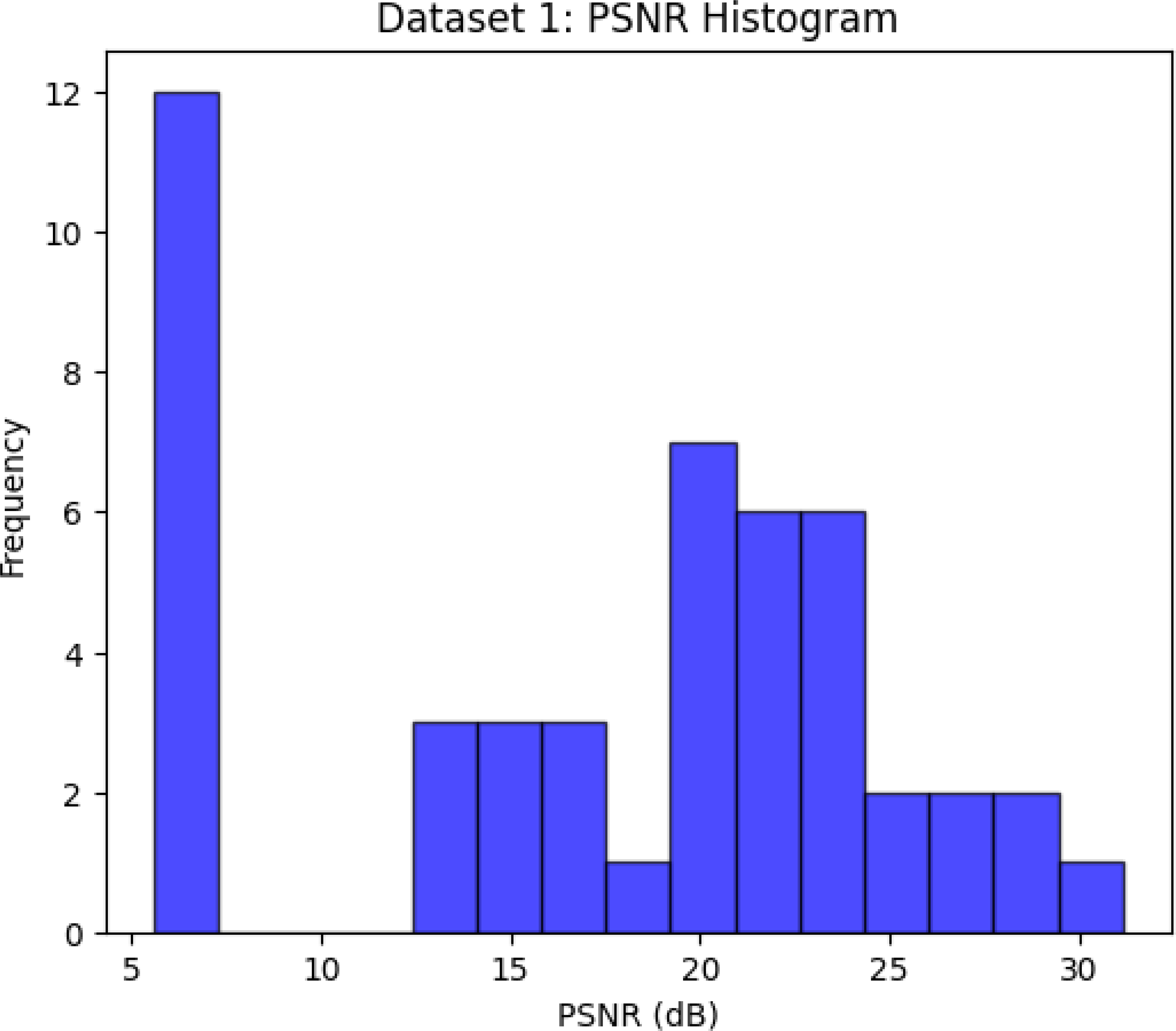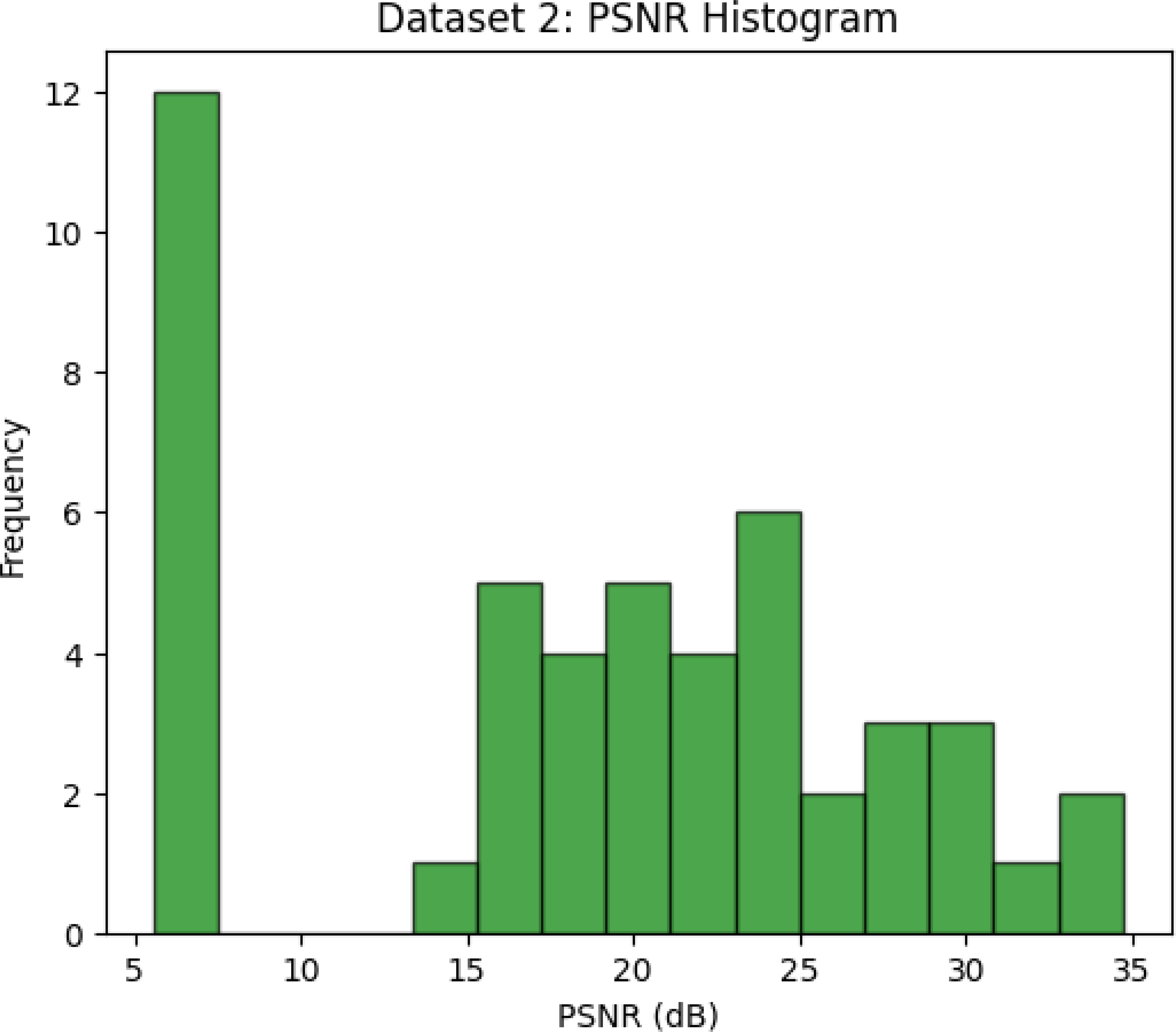 Figure 14 shows a histogram for dataset 2. The distribution is more dispersed, with hybrid techniques like ODVV achieving high PSNR values (30-35 dB). The offered approach once again shifts the histogram to the right, albeit with a lesser percentage of advantage than in Dataset 1, due to the excellent results of ODVV. These findings confirm that the proposed method is consistently effective in enhancing the faithfulness of reconstructed datasets.