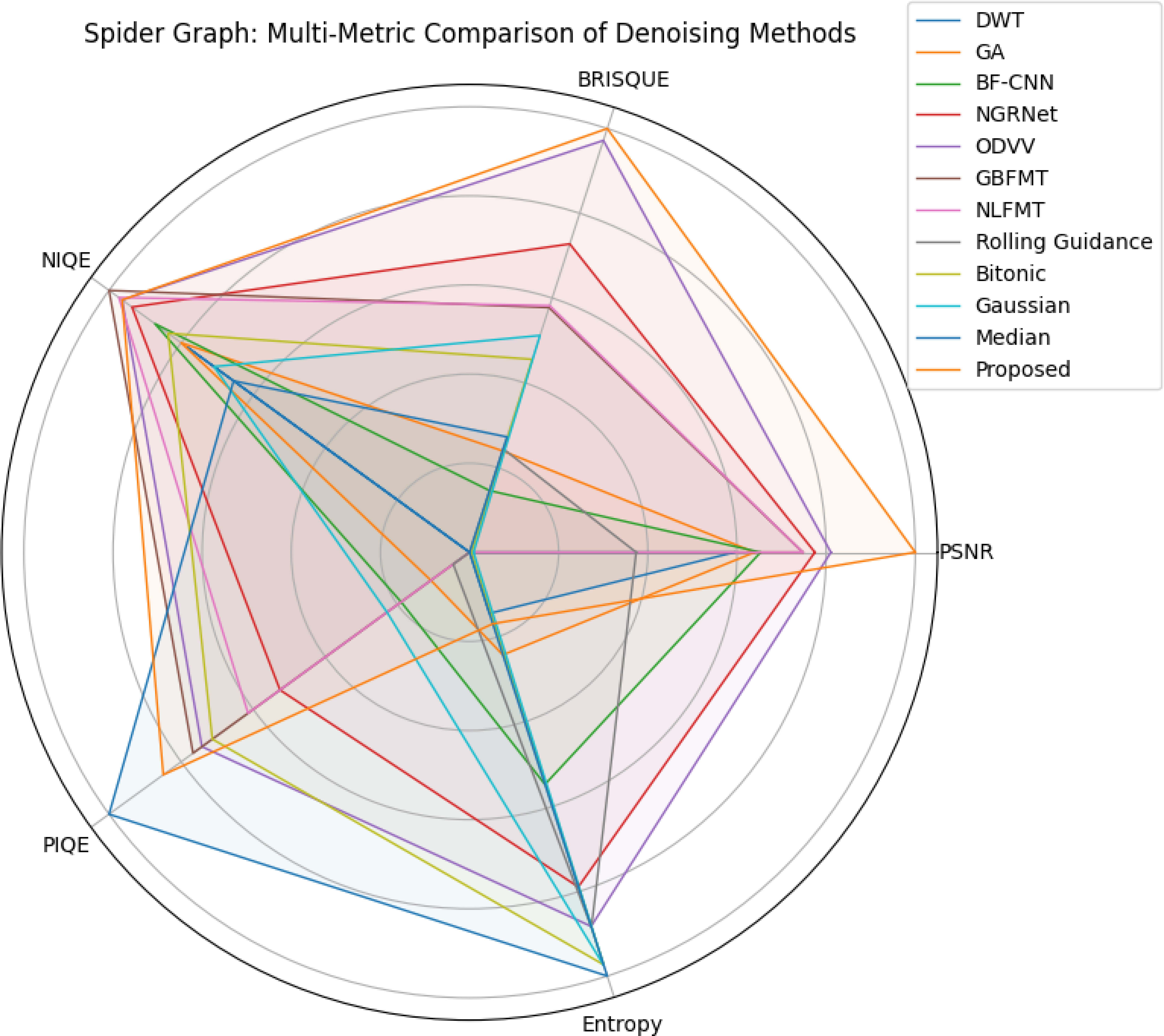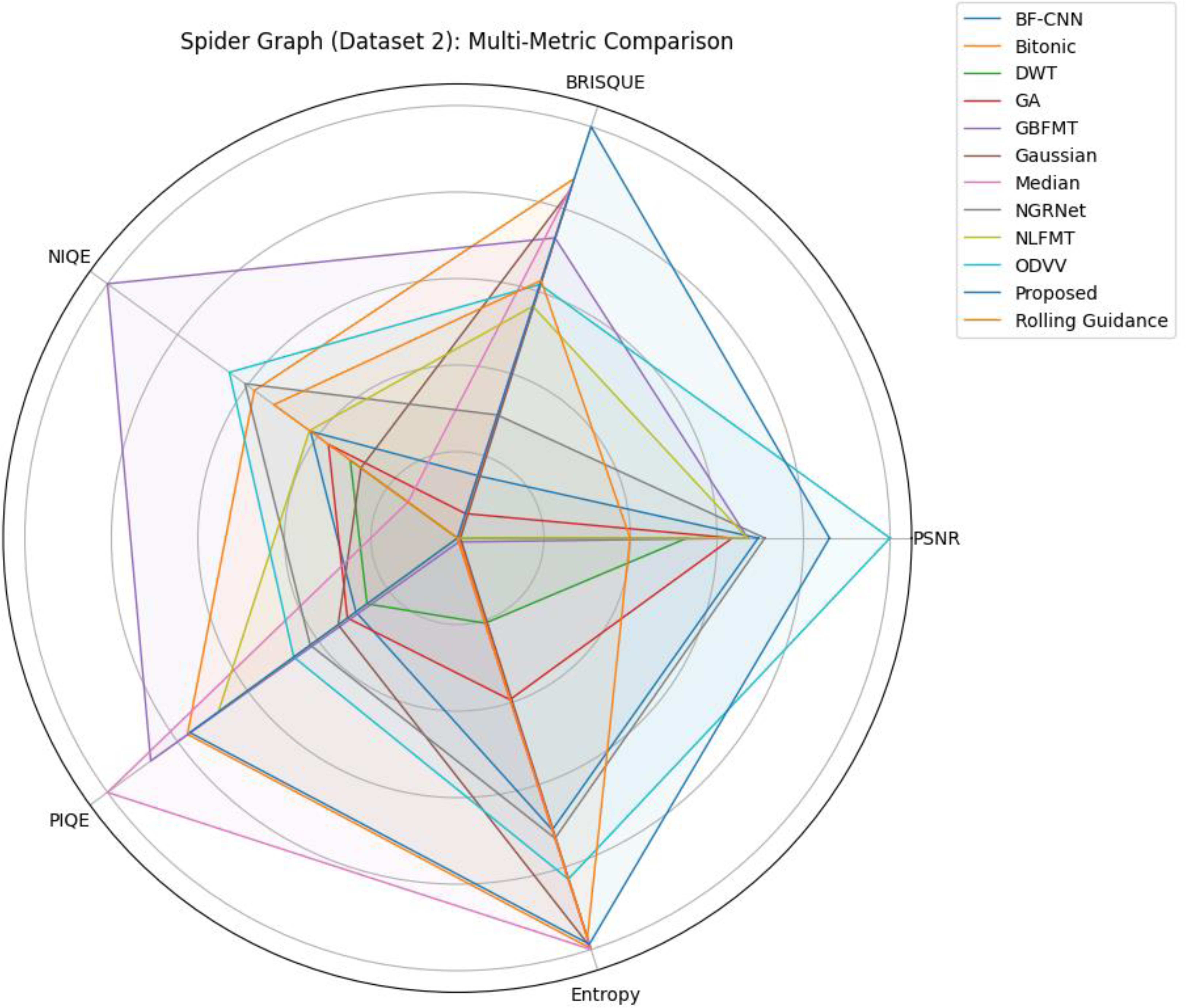 Figure 16 shows that the traditional filters are concentrated around the nearest center, indicating their low potential. ODVV and GBFMT achieve higher PSNR values in this dataset and produce larger polygons than in Dataset 1. The results of deep learning techniques (BF-CNN, NGRNet) are consistent (not uniformly dominant) along all axes. The proposed method is competitive and makes a polygon that is similar to ODVV and most of the baselines, particularly in the perceptual quality (BRISQUE, PIQE). The proposed method has a high multi-metric performance, though the size of the polygon of ODVV is smaller in this dataset. Notably, the suggested approach remains the most efficient across PSNR, entropy, and perceptual quality indicators, further demonstrating its consistency across datasets.