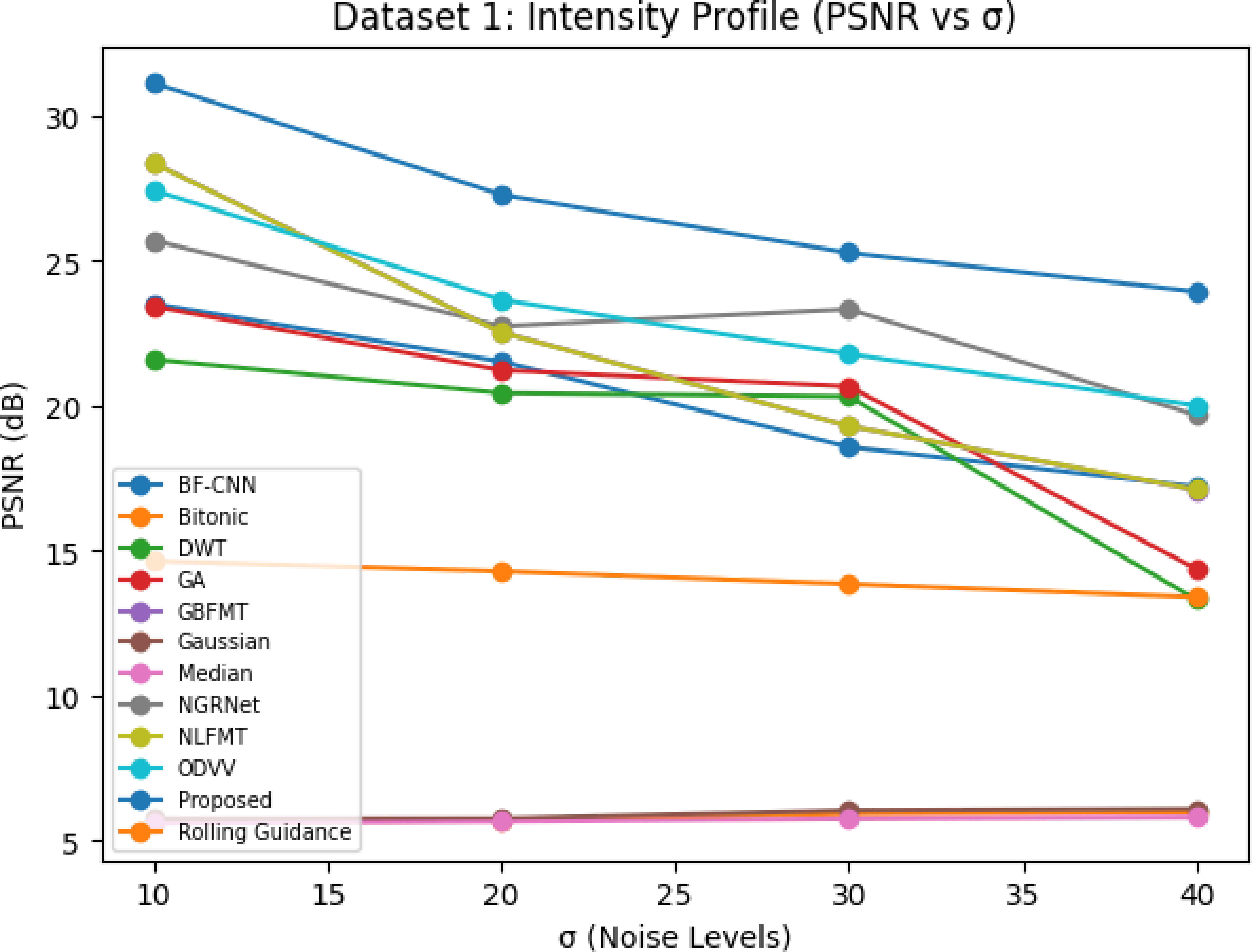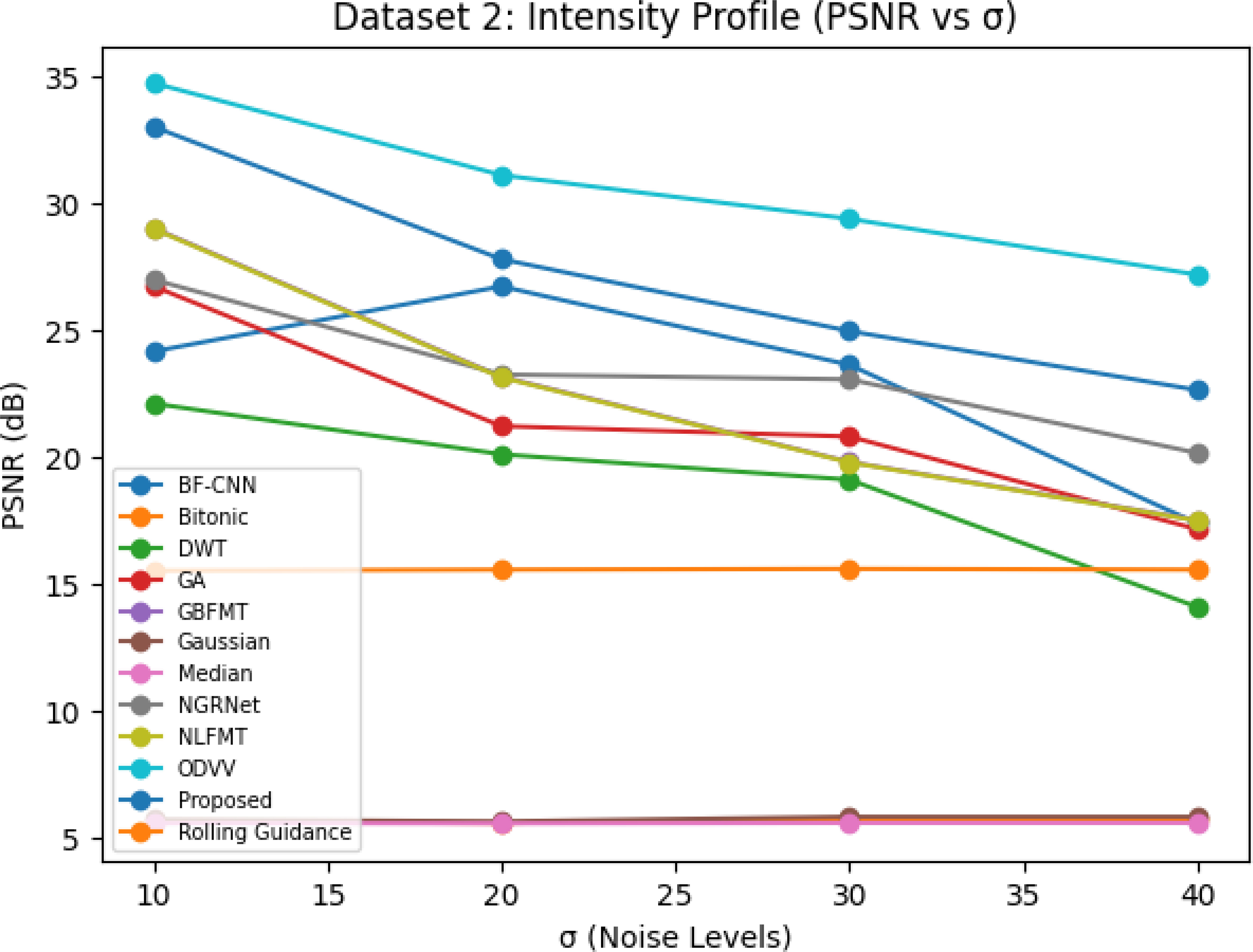 Figure 17 illustrates the intensity profiles plotted against a greater variance of Gaussian noise. In both datasets, the PSNR decreases with σ across all methods, consistent with enhanced noise suppression. In Dataset 1, the performance of traditional filters decreases rapidly with σ, and PSNR reduces below 15 dB when σ is high. The hybrid techniques and deep learning models are only moderately better, but exhibit clear degradation at σ = 40. The proposed approach ensures the maximum values of PSNR at all σ, which is above 23 dB even in highly noisy conditions.