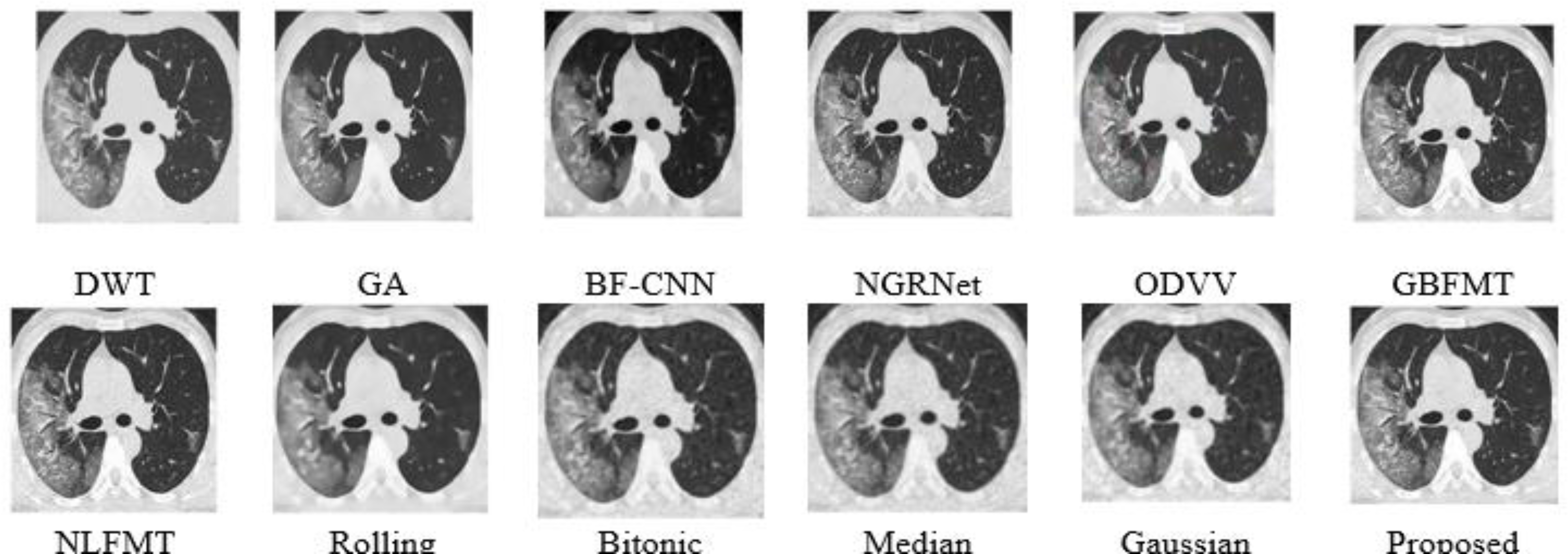 Quantitative analysis based on PSNR, entropy, BRISQUE, NIQE, and PIQE confirmed the consistent high impact of the proposed method across traditional, hybrid, and deep learning baselines. It is worth noting that the approach achieved PSNR values of 31.15 dB at HRCT and 33.00 dB at MRI when σ = 10, as well as at high noise levels (23.95 dB and 22.64 dB, respectively).