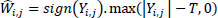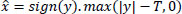where y is the noisy wavelet coefficient, T is the threshold value, and