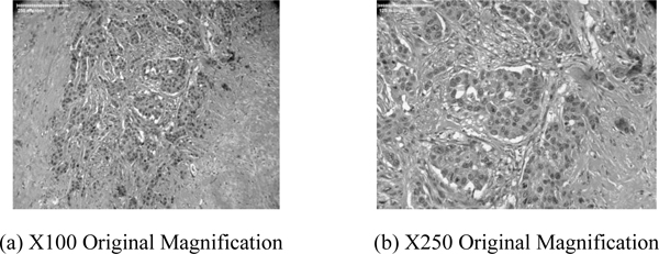 Figs. (10a and b) are higher power optical images of the breast tumor showing infiltrative growth of malignant cells that are seen in irregular nests in the fibrous stroma. Pleomorphic nuclei and frequent mitotic figures indicate a high-grade carcinoma. Figs. (10a and b) confirm that the acoustic image observed in Fig. (5b) is a group of cancer cells.