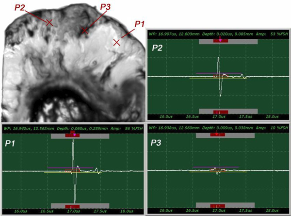Acoustic properties (i.e., the reflection coefficient, attenuation, and velocity of acoustic wave) and the surface condition (i.e., the surface roughness and discontinuities) of the specimen provide important pieces of information for diagnosis based on acoustic images. It is essential to characterize the specimen for these parameters. For this purpose, analysis of the waveforms, FFT analysis and B-Scan [73] (cross-sectional display over a vertical plane along an axis normal to the plane) need to be performed.
