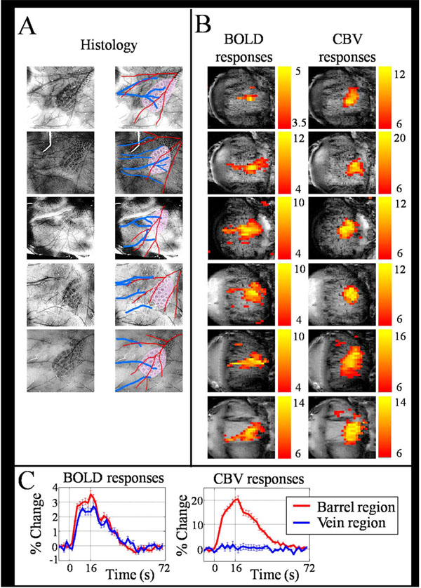 Our main finding was that hemodynamic responses reflected in BOLD and CBV-weighted fMRI data were different depending on the vascular compartment. When the functional imaging maps were related to corresponding histological sections of whisker barrel cortex and surrounding vasculature, the BOLD signal was weighted towards the venous draining system while little or no CBV changes were detected in this region.