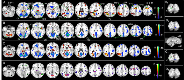 ). Statistical maps of BOLD signal resulting from a fix-effect analysis for the two groups, 1) those able to see phosphenes (Fig. A), and, 2) those unable to see phosphenes (Fig. B) (6 subjects in each group). Fig. C shows the conjunctive analysis: C = Phosphene (P) + no-phosphene (NP) and D the comparison between groups: D = P > NP (purple), NP > P (green). The color bar shows the T-score window; FWE, p < 0.05, activation (red – yellow) and deactivation (blue – green). FEF = Frontal Eyes-Field, Mb= midbrain, STG= superior temporal gyrus, TL=Temporal Lobe, AC=anterior cingulated, LG=lingual Gyrus, Th=Thalamus, ITG=Inferior Temporal Gyrus, MOG = Middle Oc-ciptal Gyrus, IOG=Inferior Occiptal Gyrus, PC=Posterior Cingulate, P=Precunious, CG=Cingulate Gyrus, MiTG=Middle Temporal Gyrus, SFG=Superior Frontal Gyrus, PG=Precentral Gyrus, MiFG=Middle Frontal Gyrus, PL = Parietal Lobe, SPL=Superior Parietal Lobe, C=Cuneus. Coronal views showing the activation near the stimulated site for groups 1(A1), 2 (B1), conjunctive analysis (C1 - highlighted in grey in Table 3) and differential analysis (D1); a sagittal view with the position of the axial slices presented in Figs. a,b,c and d.