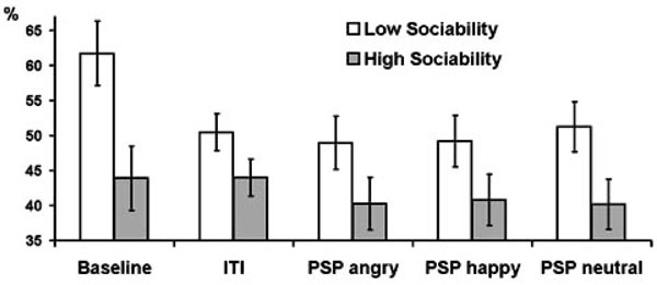 Estimated marginal means and standard errors of averaged across delta, theta, and alpha bands PAPSPG values in the five experimental conditions in subjects with below (empty bars) and above (filled bars) median scores on Sociability.