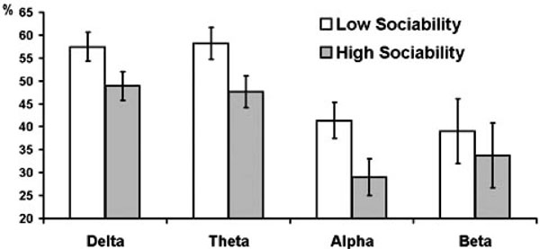 Estimated marginal means and standard errors of averaged across experimental conditions PAPSPG values in delta, theta, and alpha bands in subjects with below (empty bars) and above (filled bars) median scores on Sociability.