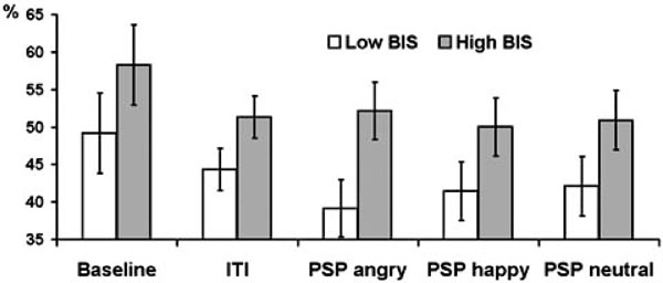 All participants completed the following psychometric measures: Behavioral Inhibition (BIS) and Behavioral Activation (BAS) were measured by a short form of the Gray-Wilson Personality Questionnaire (GWPQ [34]). Eysenckian personality dimensions were measured by a short form of the Eysenck Personality Profiler (EPP [35, 36]). This inventory contains 3 scales for each major personality dimension, plus a Lie scale. The 3 traits selected for Extraversion are Sociability, Activity and Assertiveness. The 3 traits selected for Neuroticism are Anxiety, Inferiority, and Unhappiness. The 3 traits selected for Psychoticism are Risk-taking, Impulsiveness, and Irresponsibility. Trait Anxiety was measured by the Spielberger’s State Trait Anxiety Inventory (STAI [37, 38]).