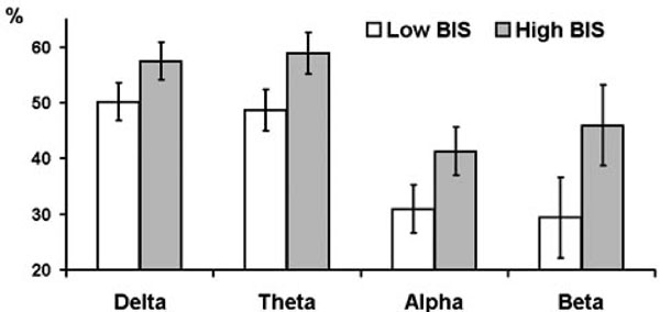 Effects of personality variables were not restricted to the theta band of frequencies. Similar effects of E were observed in delta, theta, and alpha bands. Effects of BIS were significant in all four frequency bands. It should be emphasized that this similarity refers only to the pattern of individual differences in the antero-posterior spectral power gradient values and its correlations with personality variables. It does not mean that within each individual subject the actual antero-posterior distribution of spectral power was identical in different frequencies. It is common knowledge that in healthy subjects during rest alpha power is maximal in posterior, whereas delta and theta power is higher in the frontal cortex areas.