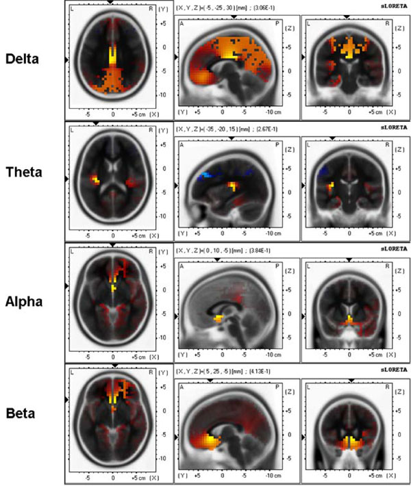 For delta band maximal correlation (0.58) was found in the posterior cingulate, BA29 [(X, Y, Z) = (-5, -50, 10)]; for theta band maximal correlation (0.64) was found in the anterior cingulate, BA32 [(X, Y, Z) = (10, 35, -5)]; for alpha band maximal correlation (0.67) was found in the posterior cingulate, BA30 [(X, Y, Z) = (-5, -55, 15)]; for beta band maximal correlation (0.51) was found in the anterior cingulate, BA24 [(X, Y, Z) = (5, 30, 0)].