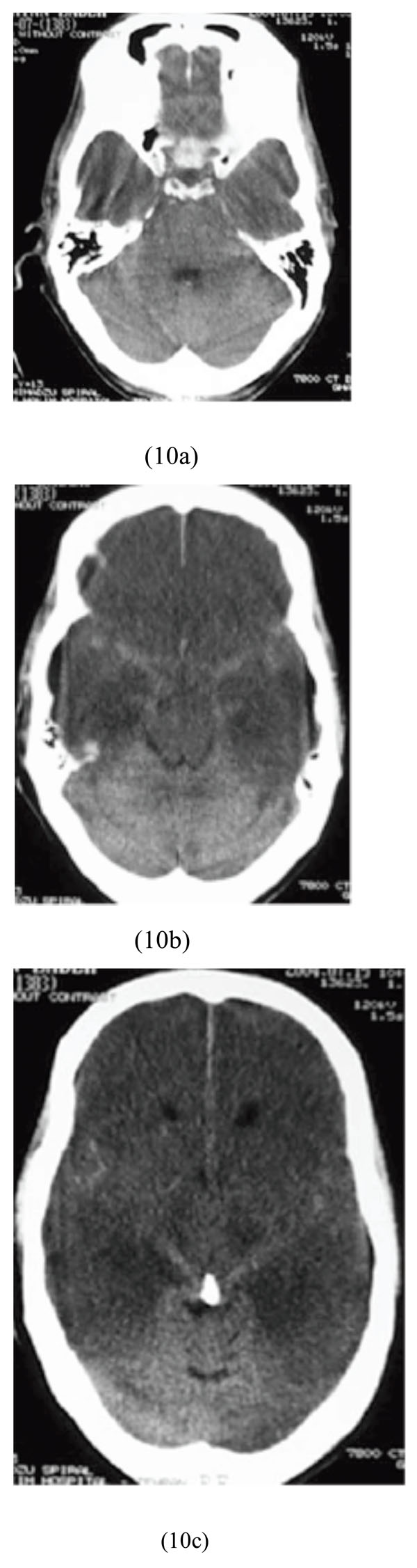 A 20-year-old man, who decided to commit a suicide with insulin injection, was brought to our hospital in comatose state with a blood sugar level of 15 mg/dL. He was admitted and then treatment with intravenous glucose was initiated. Brain CT scan showed diffuse bilateral supratentorial cytotoxic edema and pseudo-subarachnoid hemorrhage sign (Figs. 10a-10c).