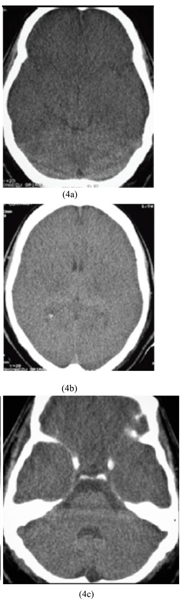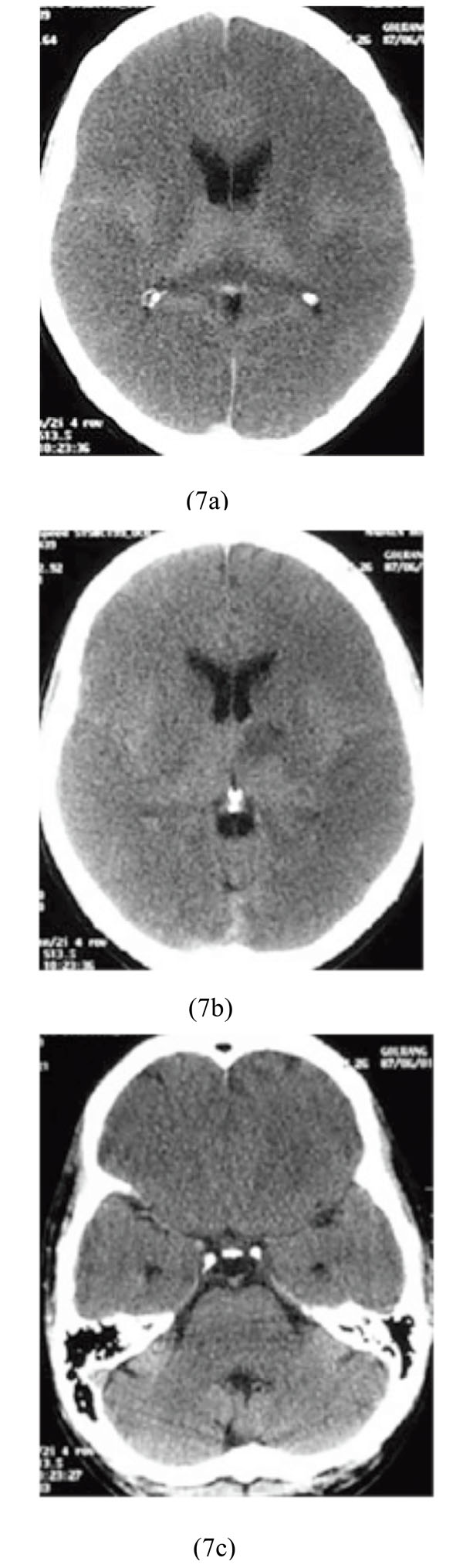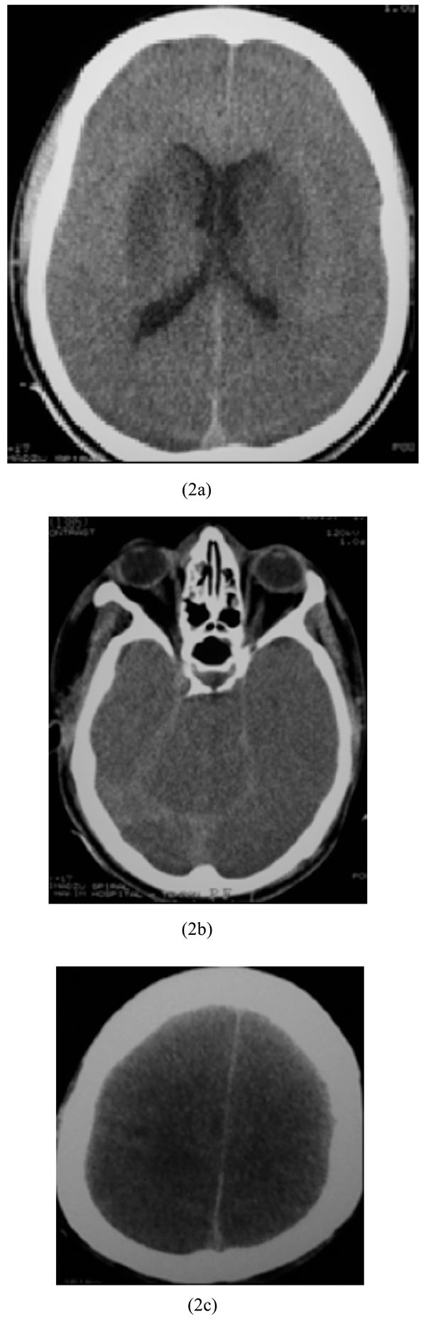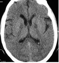 CT scans were performed during the first three to four hours of hospitalization with one scanner (Shimadzu, 7800, Japan) using the sequential techniques (collimation 10 mm, spacing 10 mm). CT window widths ranged from 100 to 120 Hounsfield Unit (HU) and levels ranged from 35 to 49. In the presence of head trauma, bone window was performed with window widths 2000 and level 400, then radiological features were determined .No oral or intravenous contrast medium was applied for the images.