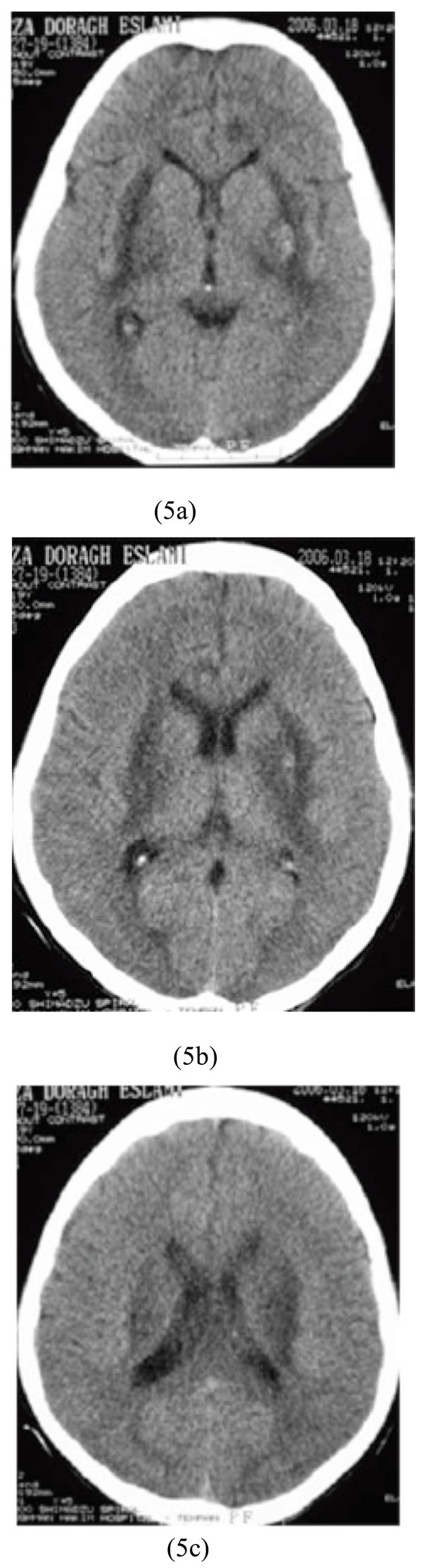 This cross-sectional study was performed in Loghman-Hakim Poison Hospital in Tehran, Iran between March and August 2006. This hospital is the biggest tertiary referral center in Iran and usually 28,000 emergency ward presentations due to poisoning are registered annually [14]. Ten interesting patients following exposure to toxic agents who were unconscious upon presentation were selected to report in this article. The patients were in comatose state, and none of them had any documented CNS structural disorders earlier. The accurate diagnosis of those who lost their life during hospitalization was confirmed by postmortem examinations.