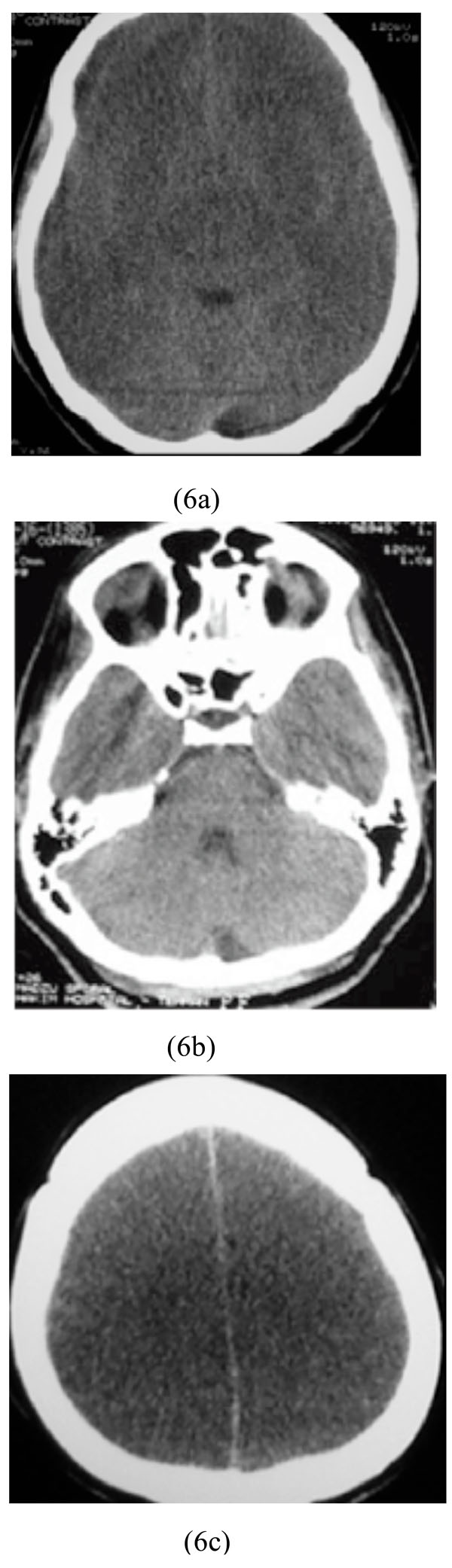 A 26-year-old crack (purer form of heroin) abuser man was admitted to our hospital. Physical examination showed: BP=110/70, PR=90/min, and RR=16/min. Brain CT scan showed massive supratentorial cytotoxic edema and pseudosubarachnoid hemorrhage sign as obviously reversed gray and white matter differentiation with sparing of infratentorial region. Also, a focus of hypodensity involving the left basal ganglia was observed (Figs. 7a-7c).