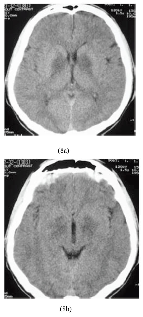 A 21-year-old male farmer was admitted because of suicidal ingestion of organophosphate toxin. His symptoms started with sweating, headache, nausea and vomiting, muscular weakness, and dizziness. Upon admission, he had pin-point pupils which followed by loss of consciousness, urinary incontinence and finally seizure. His vital signs were as follows: BP=90/60, PR=50/min, RR=12/min. Brain CT scan showed bilateral hypodensity lesions of the basal ganglia indicative of infarctions (Figs. 8a-8b).