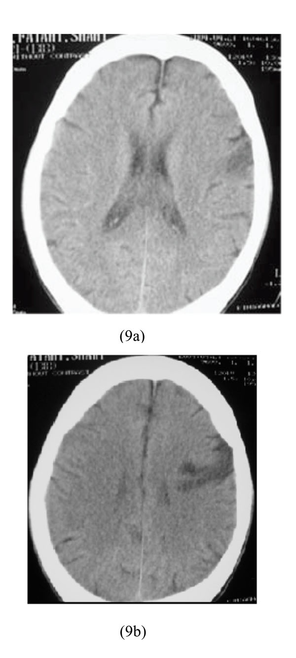 A 32-year-old heroin abuser man was hospitalized due to non-cardiogenic pulmonary edema and right hemiparesia as a result of heroin intoxication. Physical examination showed: BP=90/60, PR=90/min, RR=12/min and right hemiparesia. He underwent brain CT scan which revealed left frontal lobe infarction (Figs. 9a-9b).