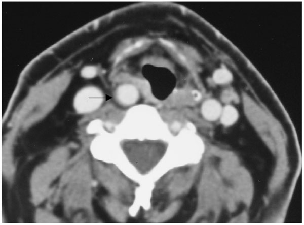 Axial enhanced CT scan t throughout the supraglottic level shows aberrant right ICA causing focal bulging at the level of the right pyriform sinus with right aryepiglottic fold displacement (arrow). (Radiological classification of this patient was considered C,1).