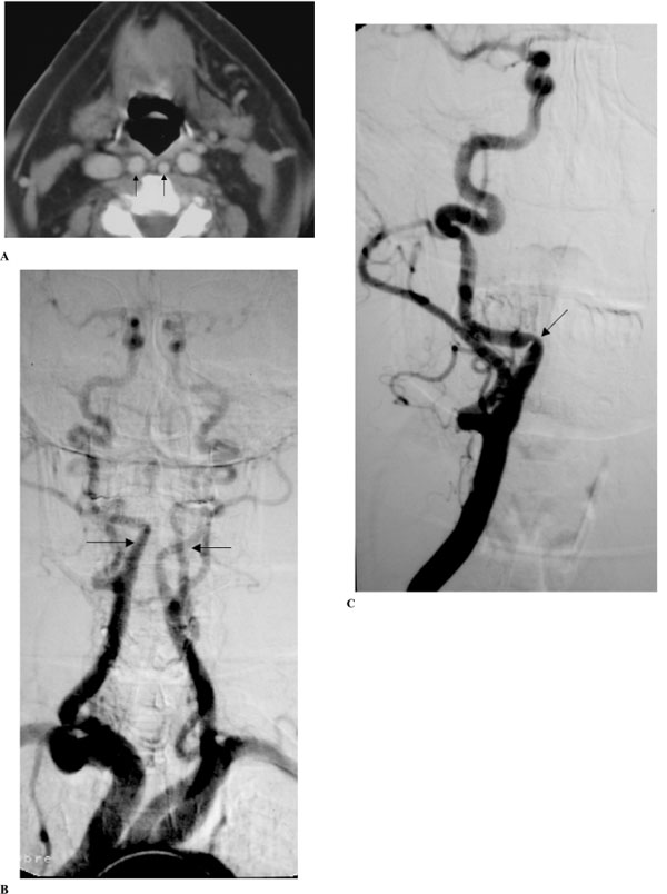 Upper aortogram of both ICA’s in the early arteriographic phase (B) shows bilateral medialization of the cervical segment of the ICA’s (arrows). Notice tortuosity of the proximal portions of the right common and external carotid arteries. Selective injection of the right common carotid artery in early arteriographic phase (C) shows progressive medialization of the proximal segment of ICA and then abrupt change in the course of the artery and then the artery regains its normal position after a short horizontal segment. Notice extrinsic arterial notch pinpointing the place of arterial course change and producing a focal non-atherosclerotic stenosis (arrow).