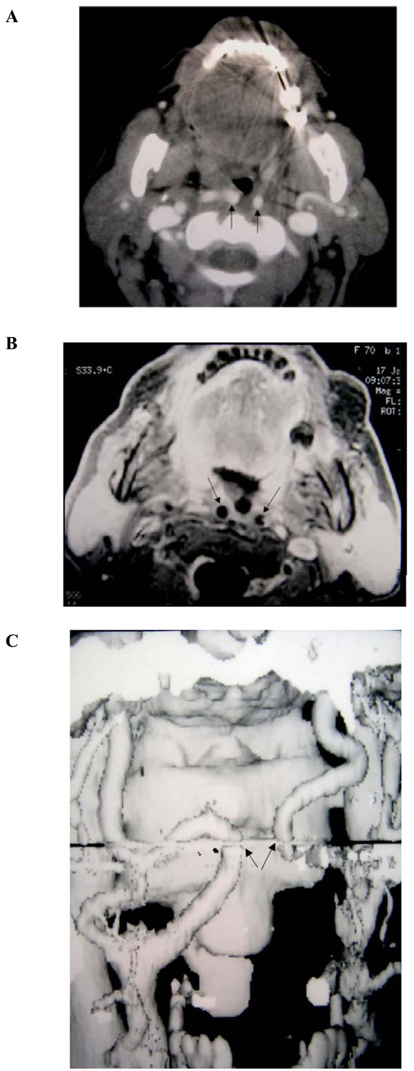 (A-C). Bilateral medialization of the cervical course of both internal carotid arteries (patient #10). Enhanced helical CT scan throughout the neck.
