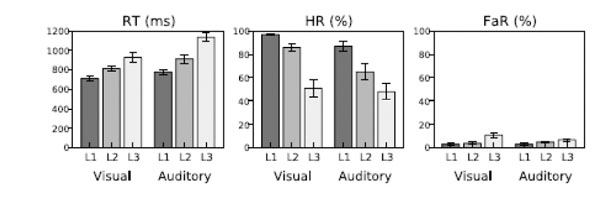 Performance in the visual and auditory tasks as a function of task difficulty level (L1–L3).