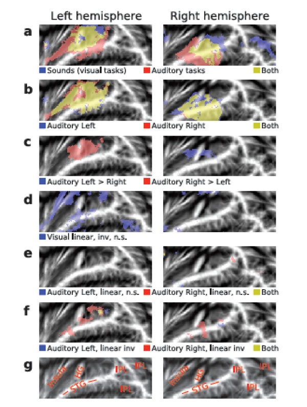 AC activations to sounds in the absence of auditory attention were isolated by contrasting activations during the visual tasks with activations during the 15-s breaks with no stimuli. In both hemispheres, HG, areas posterior to HG (planum temporale), anterior insula and, in addition, areas in the right IPL were activated by presentation of sounds during visual tasks (Fig. 3b, blue and yellow; for anatomical labels, see Fig. 3g). General effects of auditory tasks were isolated by contrasting AC activations during auditory and visual tasks. AC activations were enhanced during auditory as compared with visual attention task in wide AC regions extending from the anterior to posterior STG and including HG (Fig. 3a, red and yellow). Auditory Left (Fig. 3b, blue and yellow) and Auditory Right (red and yellow) tasks activated (vs. visual tasks) similar areas (for individual subject data see Supplementary Fig. F1). However, left AC activations were higher during Auditory Right than during Auditory Left task (Fig. 3c, red). Correspondingly, right AC activations were enhanced during contralateral attention (blue).