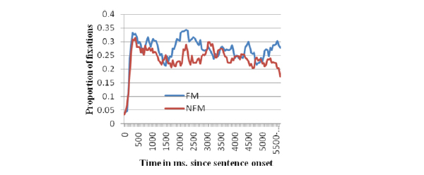 Picture displays and corresponding sentences (FM and NFM) were rated in which participants (N=15) were asked to judge for compatibility. We also did rating studies for semantic equivalence of FM and NFM sentences in the context of the picture. It was rated on a 5 point Likart scale where “5”indicated “highly compatible/match” and “1” as “highly incompatible/mismatch”. The selected stimuli had mean rating of 4.1(SD=0.41), 4.3(SD=0.37) for FM and non-Fm conditions respectively. Participants who took part in the ratings of pictures and sentences were not included in the main eye tracking study.
