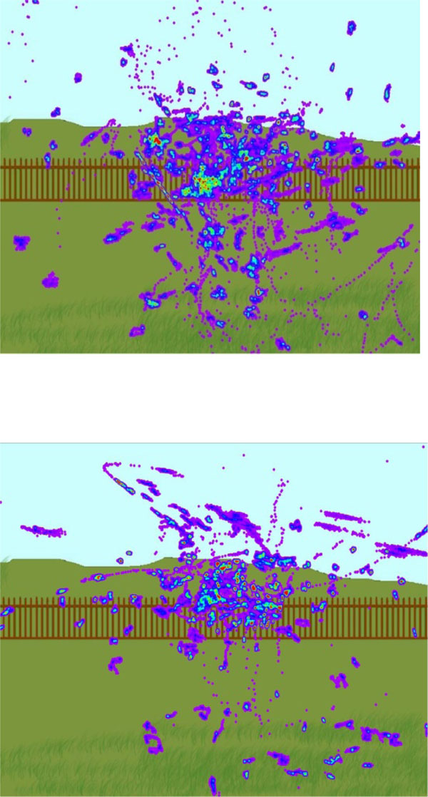 Eye movement data provide direct measurement of overt visual attention. Eye movement scan paths show time bound shifts in visual attention during the course of cognitive processing. Fig. (3) shows dispersion of visual attention to the AOI for the fictive motion condition for an example stimulus for ten subjects (upper panel). The lower panel shows the same measurements for the non fictive sentence for that stimulus. It is fairly evident from the scan path that subjects scanned the entire path area when they listened to the fictive motion sentence and allocated more visual attention while it is not the case with the literal sentences. These visualizations of deployment of overt visual attention are valuable in understanding how subjects look at a picture and where they look most.