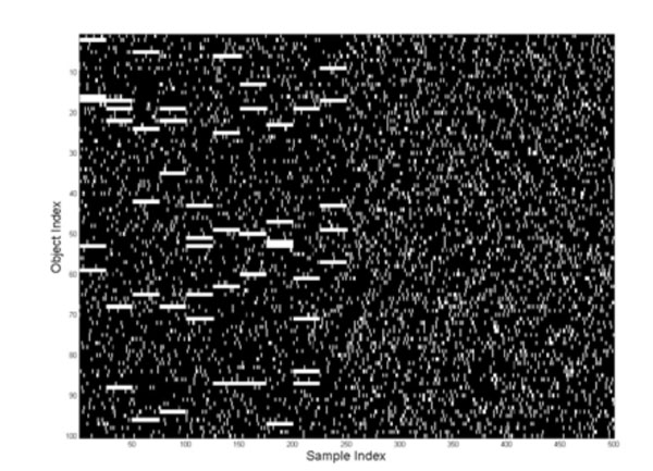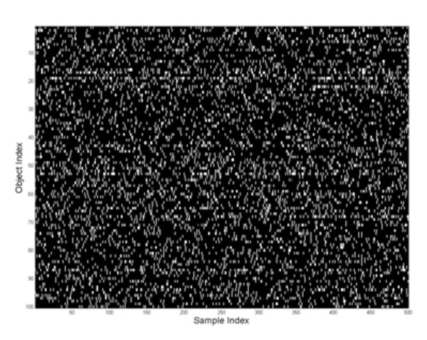 We set the total number of objects to Do=100; the number of objects observed in a situation Dp = 10; in situations important for learning there are 5 objects characteristical of this situation, Ds = 5; in clutter situations, Ds = 0. There are total of 10 important situations, each is simulated 25 times; in each simulation Ds = 5 characteristic objects are repeated and the other 5 selected randomly. This yields total of 250 situations. We also generated 250 clutter situations, in which all objects are randomly selected. This data is illustrated in Fig. (2). The objects present in a situation (x=1) are shown in white and absent, x=0, are shown in black. In this figure objects are along the vertical axes and situations are along the horizontal axes; situations are sorted, so that the same situations are repeated. This results in horizontal white lines for characteristic objects for the first 10 situations.