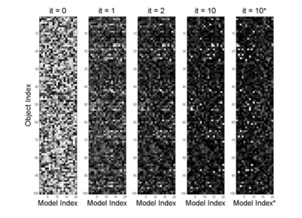 The convergence results are shown in 5 columns; the first one illustrates the initial vague models and the following show model changes at iterations it = 1, 2, and 10. Each column here illustrates all 20 models, along the horizontal axes, and objects are shown along the vertical axes as in previous figures. The last column (10*) shows iteration 10 sorted along the horizontal axes, so that the 10 models most similar to the true ones are shown first. One can see that the left part of the figure contains models with bright pixels (characteristic objects) and the right part of the figure is dark (clutter models).