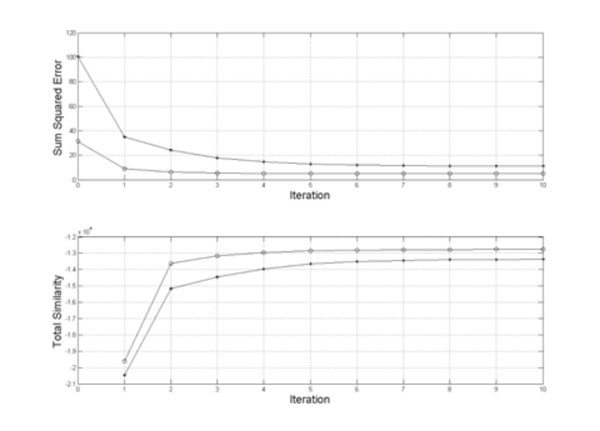 Lines with black dots illustrate performance of the case considered in the previous section without language effects. Convergence is measured using the total similarity between the data and models (lower part of the figure) and using errors between the model probability and data (the upper part of the figure; for every situation the best matching model is selected). Lines with open circle indicate performance with language supervision. In each case convergence is attained within few iterations, and language supervision improved performance, as expected.