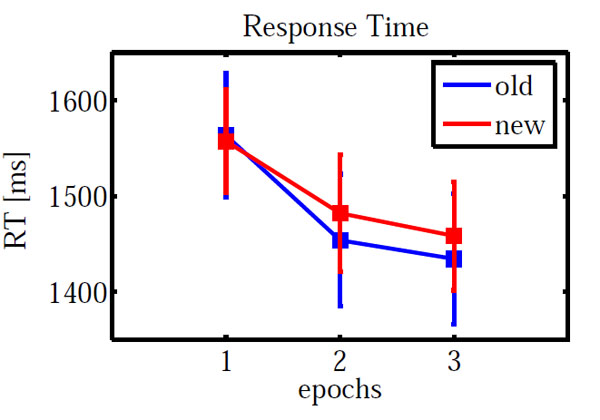 A paired sample t-test on new-old response times in epoch 3 yielded no significant difference (t(-0.472) = 0.645).