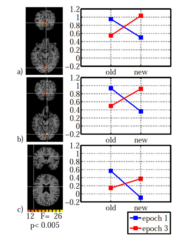 Brain areas with a significant configuration x epoch interaction: a) striate cortex, b) lingual gyrus, c) inferior frontal gyrus. Areas are shown on the left with the associated estimated signal amplitudes on the right. The y-axis indicates β-values. Old: repeated distractors, new: random distractors. Left hemisphere is shown on the left.