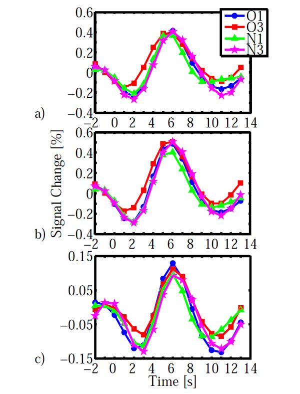 BOLD-time courses obtained in the three areas shown in Fig. (3). a) striate cortex, b) lingual gyrus, c) inferior frontal gyrus. BOLD time courses are averaged across participants. Time = 0s indicates display onset. Abbreviations: O: old, N: new, 1, 3: epochs.